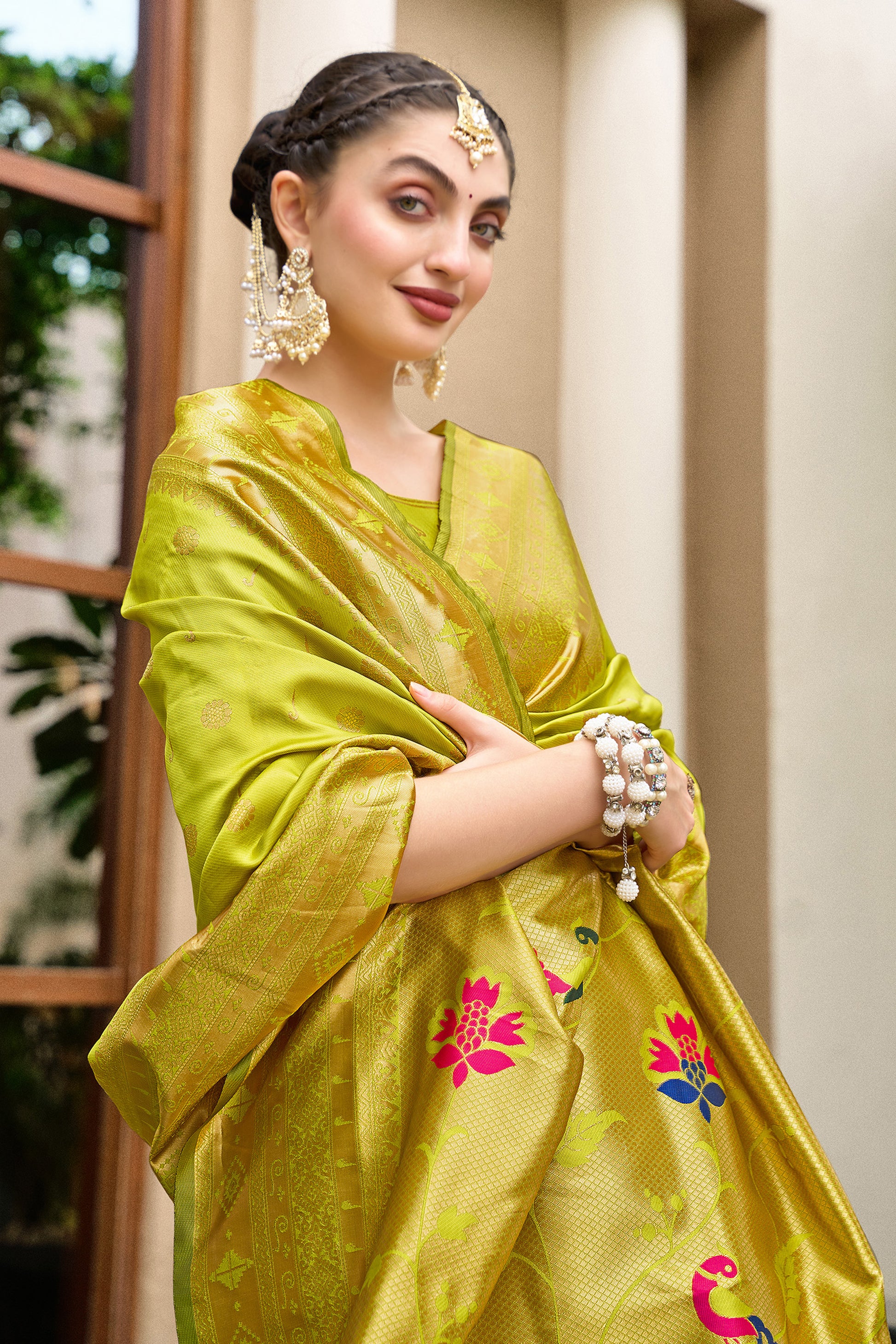 Parrot Green Silk Saree Peacock Floral Pallu Traditional Festive Wear