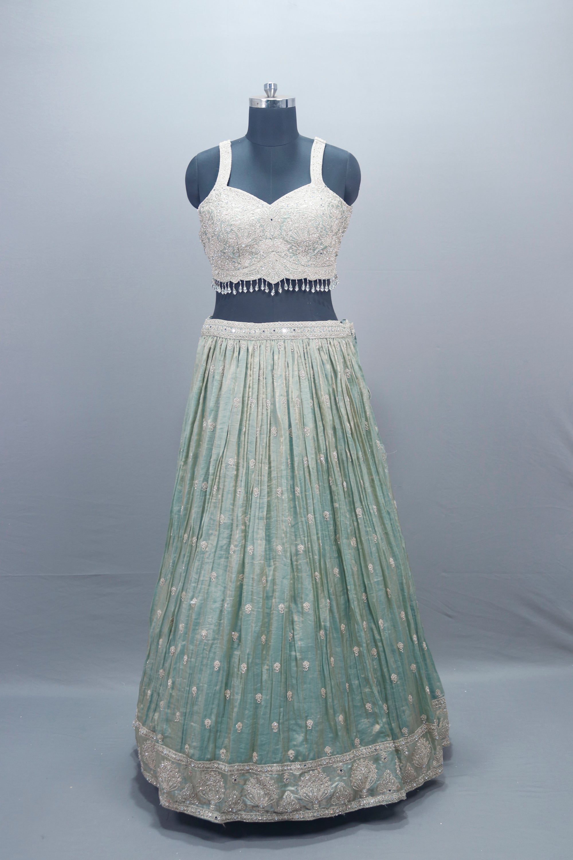 Add a touch of grace and sophistication to your wardrobe with this Pastel Green Lehenga Choli with Dupatta Party Wear a perfect blend of elegance and modern charm. Crafted from lightweight fabric, the lehenga features delicate thread embroidery, sequin highlights, and intricate border detailing that create a refined look. The embroidered blouse with bead tassels adds a stylish edge, while the sheer dupatta with a shimmering border completes the outfit. Ideal for weddings, receptions, sangeet, cocktail parties, and festive occasions, this designer lehenga choli ensures comfort without compromising on style. Its pastel tone makes it a versatile choice for both day and evening events, offering a refreshing alternative to traditional bold colors.