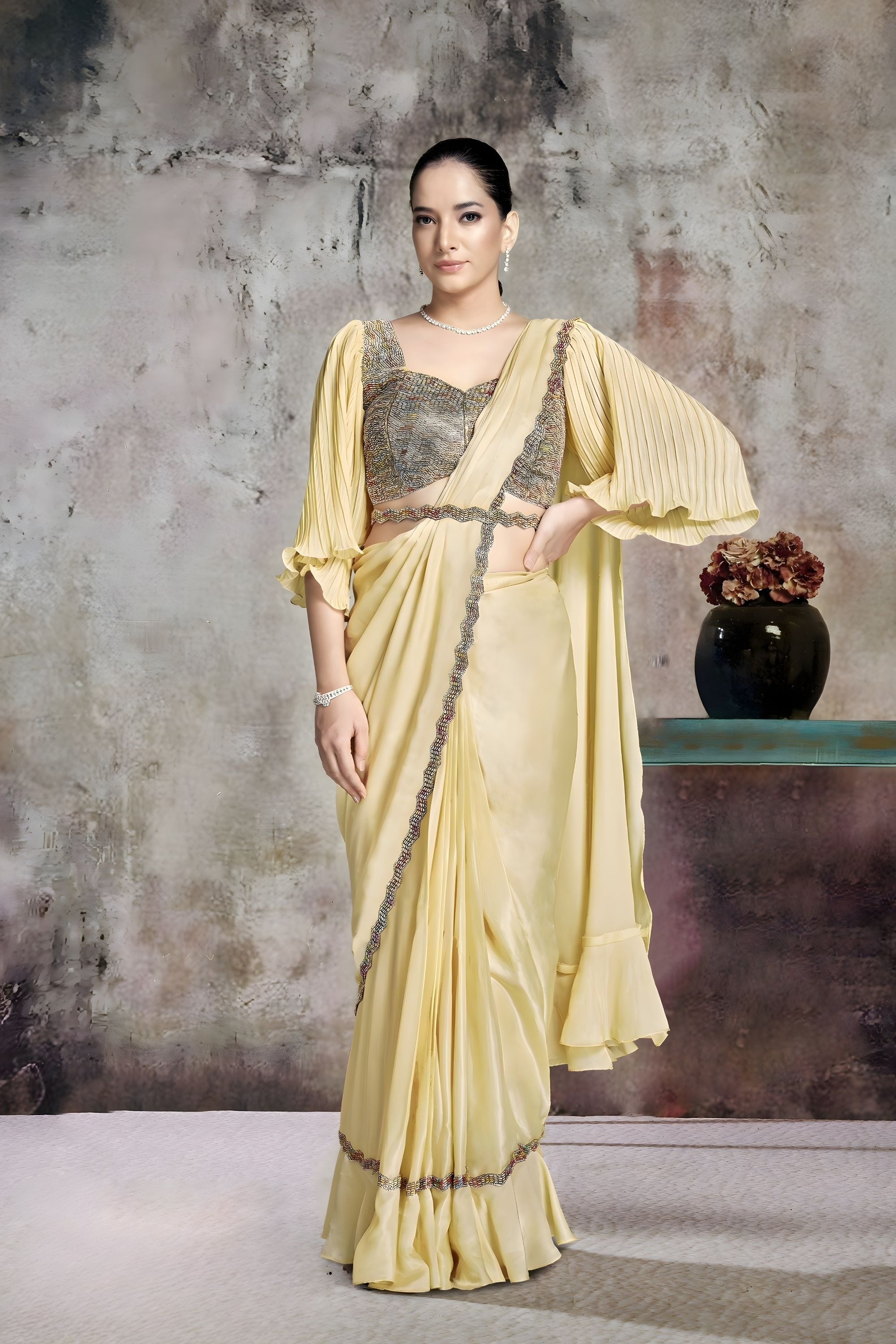 Refresh your ethnic wardrobe with this Pastel Yellow Designer Saree Cape Sleeves Embroidered Blouse Ready To Wear , a perfect blend of modern sophistication and timeless grace. Designed for weddings, receptions, festive celebrations, engagement ceremonies, and cocktail parties, this saree radiates soft glamour and refined elegance. Crafted in a soothing pastel yellow shade, this designer saree features a delicately embellished border that adds subtle shimmer and luxurious appeal. The highlight of this ensemble is the intricately embroidered blouse paired with stylish pleated cape sleeves, creating a contemporary fusion look that stands out effortlessly. The flowing drape enhances the silhouette, offering a graceful and flattering fit.