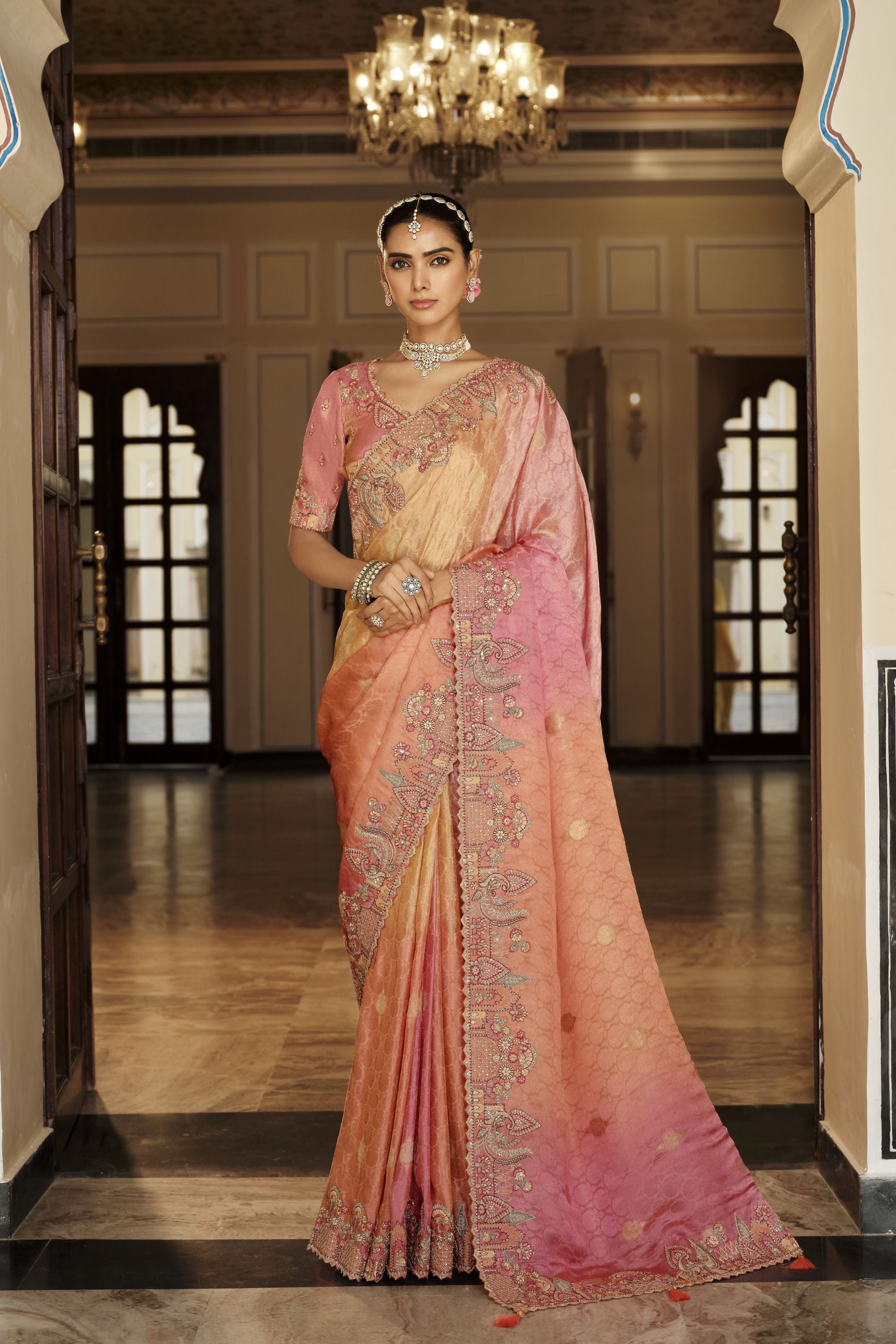 Peach Pink Golden Silk Blend Designer Saree Embroidery Border