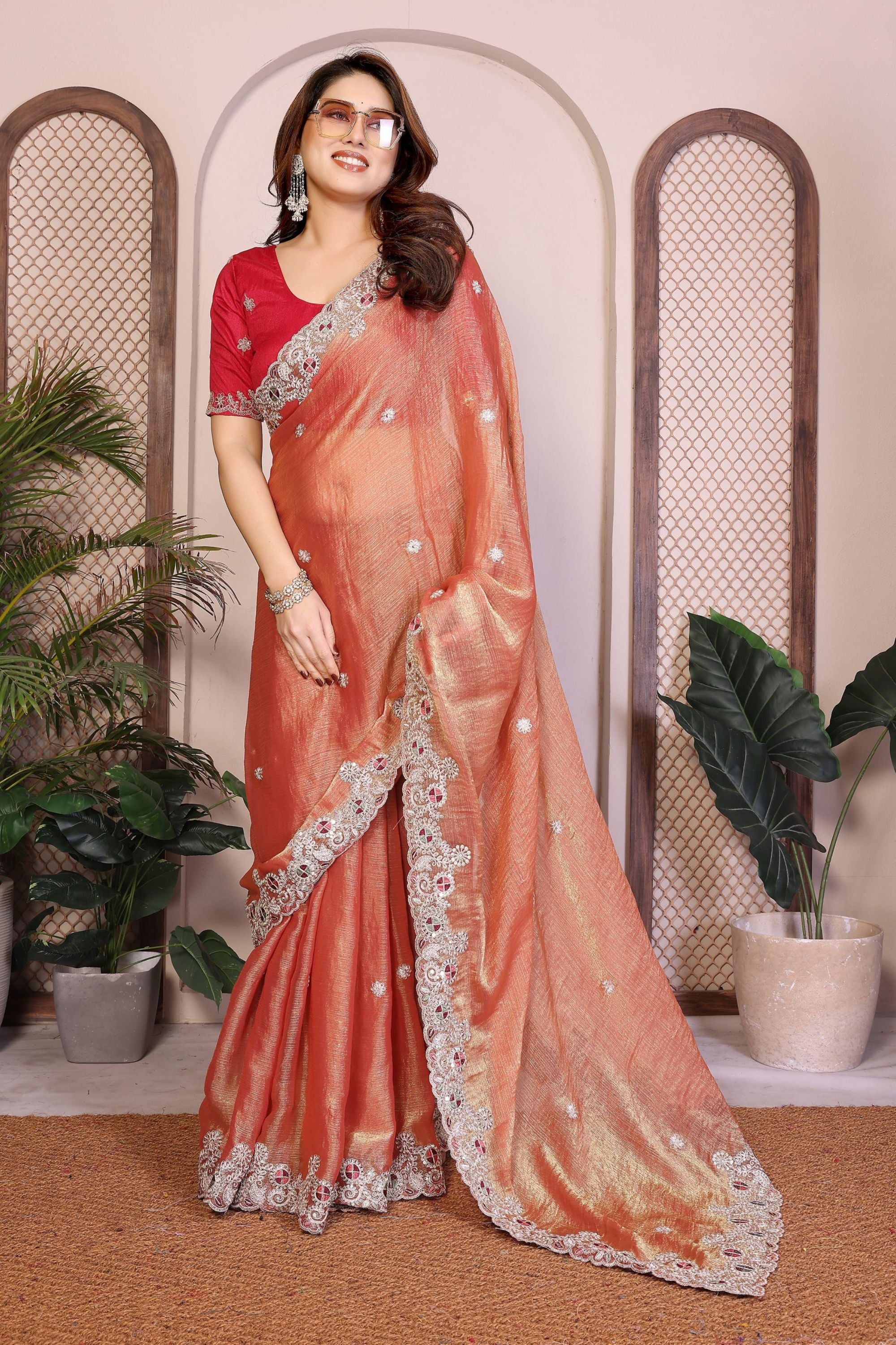 Enhance your ethnic elegance with this stunning Peach Silk Saree Embroidery Border Designer Blouse Party Wear , designed to offer a perfect blend of tradition and modern style. Crafted from premium-quality silk blend fabric, this saree features a subtle sheen and a graceful drape that flatters every body type. The highlight of this saree is its intricate lace embroidery border, adding a luxurious and sophisticated touch to the overall look. Paired with a contrasting designer red blouse, this saree creates a striking combination ideal for weddings, festive celebrations, receptions, and party wear. The lightweight yet rich texture ensures comfort without compromising on style, making it a must-have addition to your wardrobe.