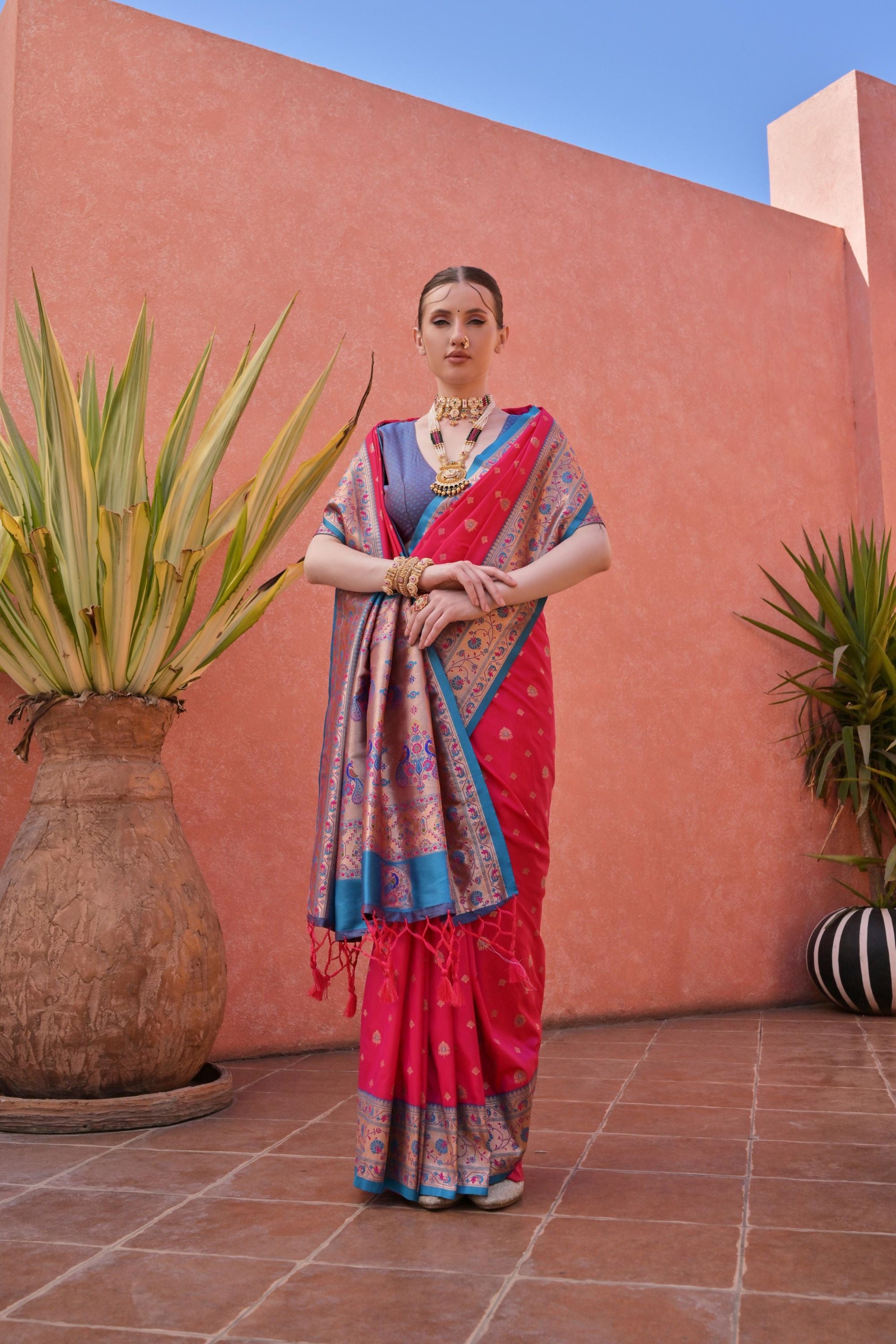 Elevate your ethnic wardrobe with this stunning Pink And Blue Kanjivaram Silk Saree with Golden Zari Border Contrast Blouse , beautifully crafted with rich golden zari weaving to offer a luxurious and timeless appeal. Designed with intricate ethnic motifs and a traditional detailed pallu, this saree reflects classic craftsmanship combined with modern elegance. The contrasting blue blouse enhances the overall appeal, making it a perfect choice for grand celebrations. Whether you are attending a wedding, festival, engagement, sangeet, or cultural event, this saree ensures you look elegant and regal. The soft and premium silk fabric drapes comfortably and adds a graceful shine, making you stand out with effortless style. Make every occasion memorable with this heritage-inspired silk saree a perfect blend of tradition, beauty, and sophistication.