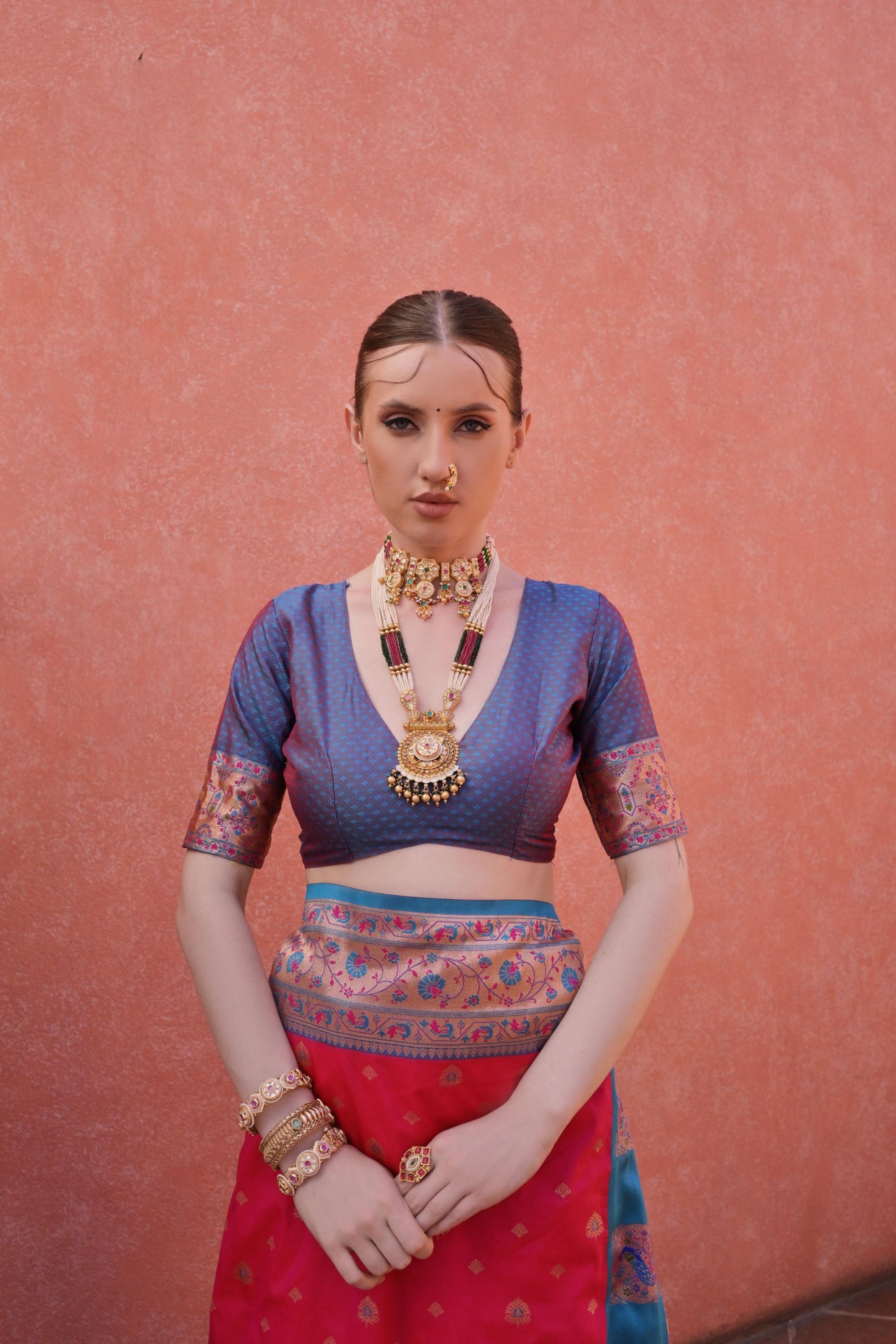 Pink And Blue Kanjivaram Silk Saree with Golden Zari Border Contrast Blouse