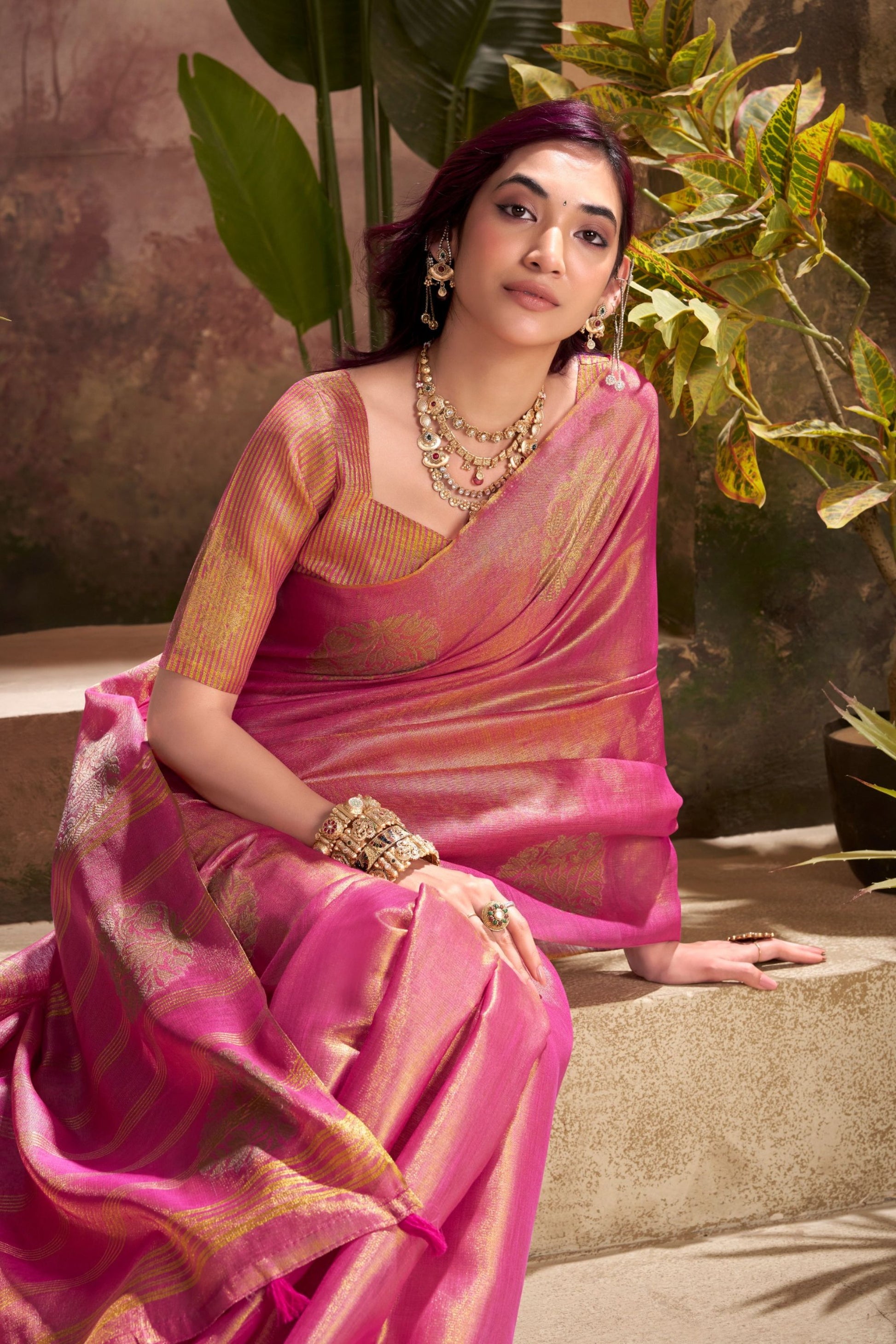 Elevate your ethnic charm with thi Pink Banarasi Silk Saree Festive Wear Saree, a perfect blend of tradition and luxury. Crafted from premium quality silk, this saree features intricate golden zari motifs and a rich pallu that enhances its regal appeal. The vibrant pink shade adds a touch of elegance, making it ideal for weddings, festive celebrations, parties, and traditional occasions. Designed for the modern woman who loves timeless classics, this Banarasi saree drapes beautifully and ensures all-day comfort while keeping you in the spotlight. Pair it with statement jewelry to complete your royal ethnic look.