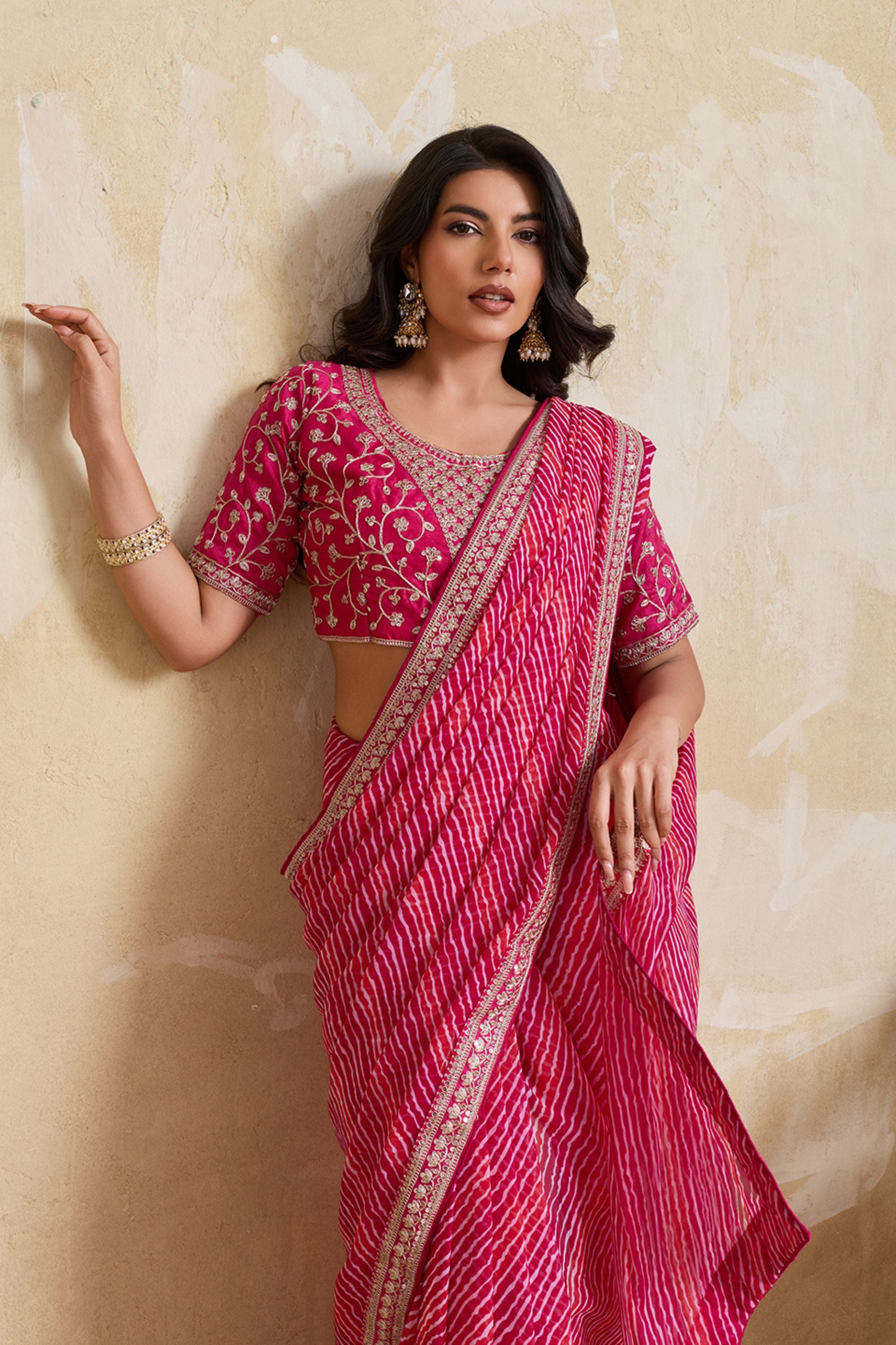 Step into elegance with this Pink Georgette Saree with Golden Embroidered Border Designer Blouse, crafted to bring out timeless ethnic charm with a modern festive appeal. Made from lightweight and flowy georgette fabric, this saree features a classic Leheriya stripe pattern that adds graceful movement and a flattering drape. The saree is beautifully finished with a rich golden embroidered border, enhancing its luxurious look and making it perfect for special occasions.