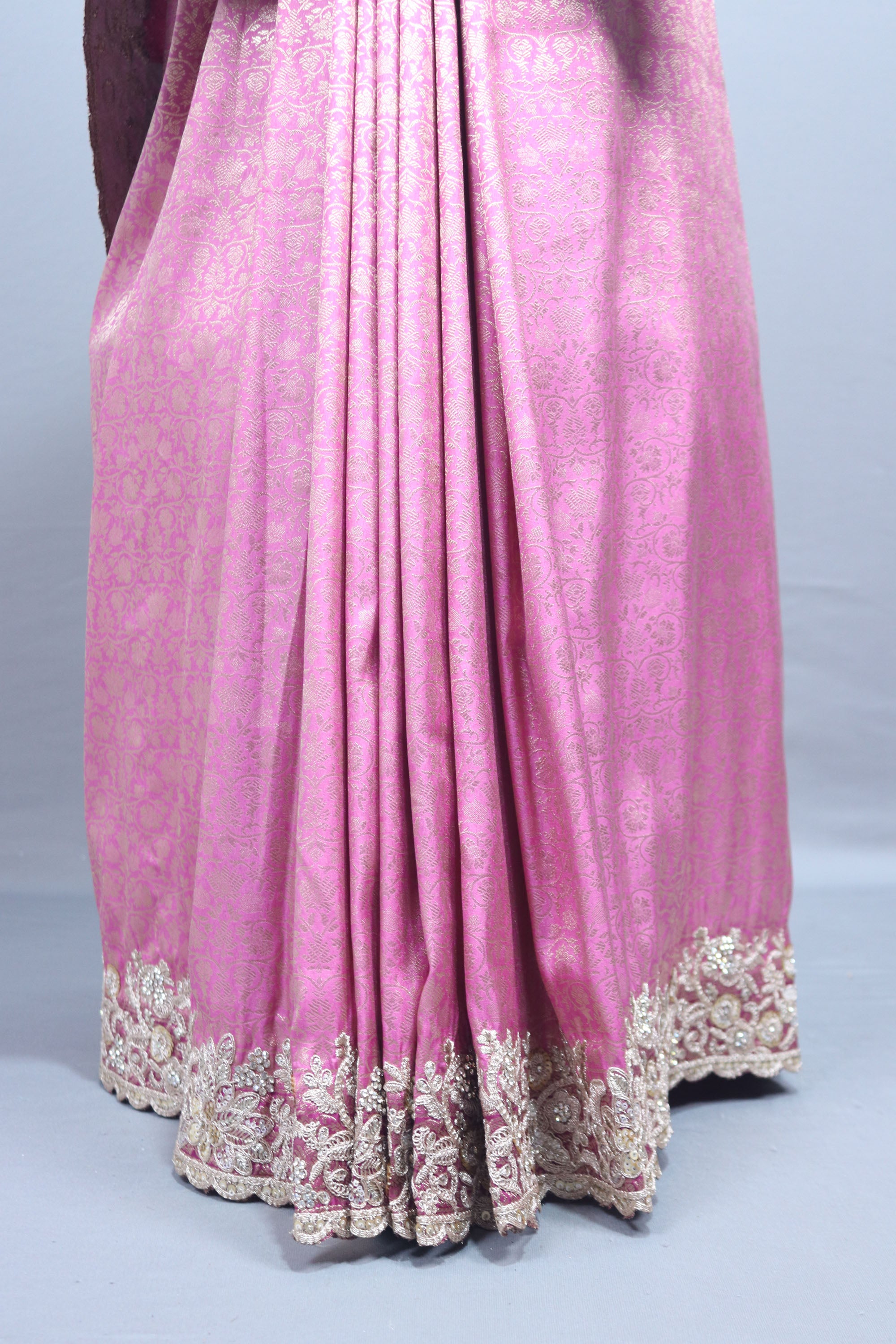 Pink Silk Saree with Silver Zari Embroidered Lace Border