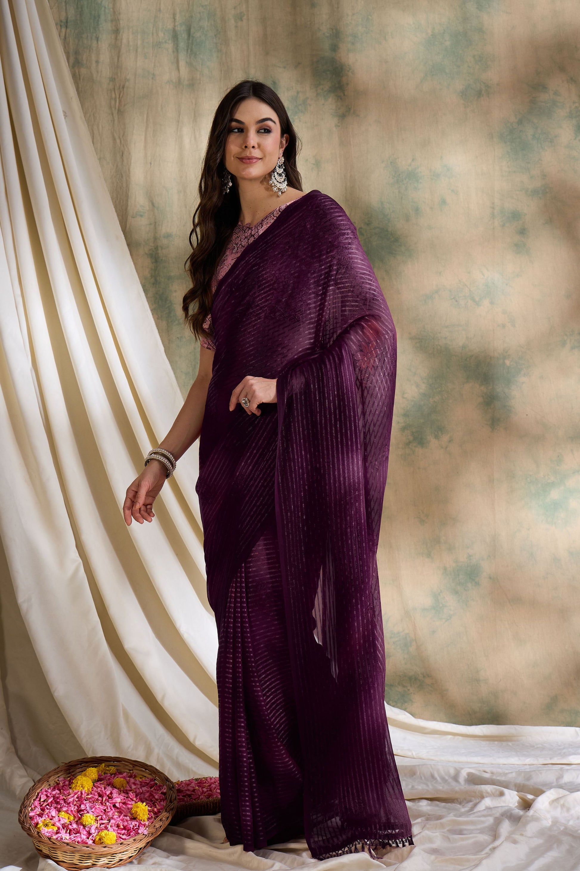 Elevate your festive and wedding wardrobe with this exquisite Plum Purple Organza Saree With Designer Blouse Festive Wear Saree , designed to bring effortless elegance to every occasion. Crafted from premium lightweight organza, the saree features delicate vertical striped weaving that adds natural shimmer and graceful movement. The rich plum shade enhances its luxurious appeal, making it perfect for celebrations, receptions, and evening functions. Paired with a beautifully designed pink printed blouse, this saree creates a striking color contrast that blends tradition with modern sophistication. The soft, sheer texture drapes beautifully, offering comfort and style for all-day wear. Complete the look with statement earrings and bangles for a timeless ethnic ensemble.