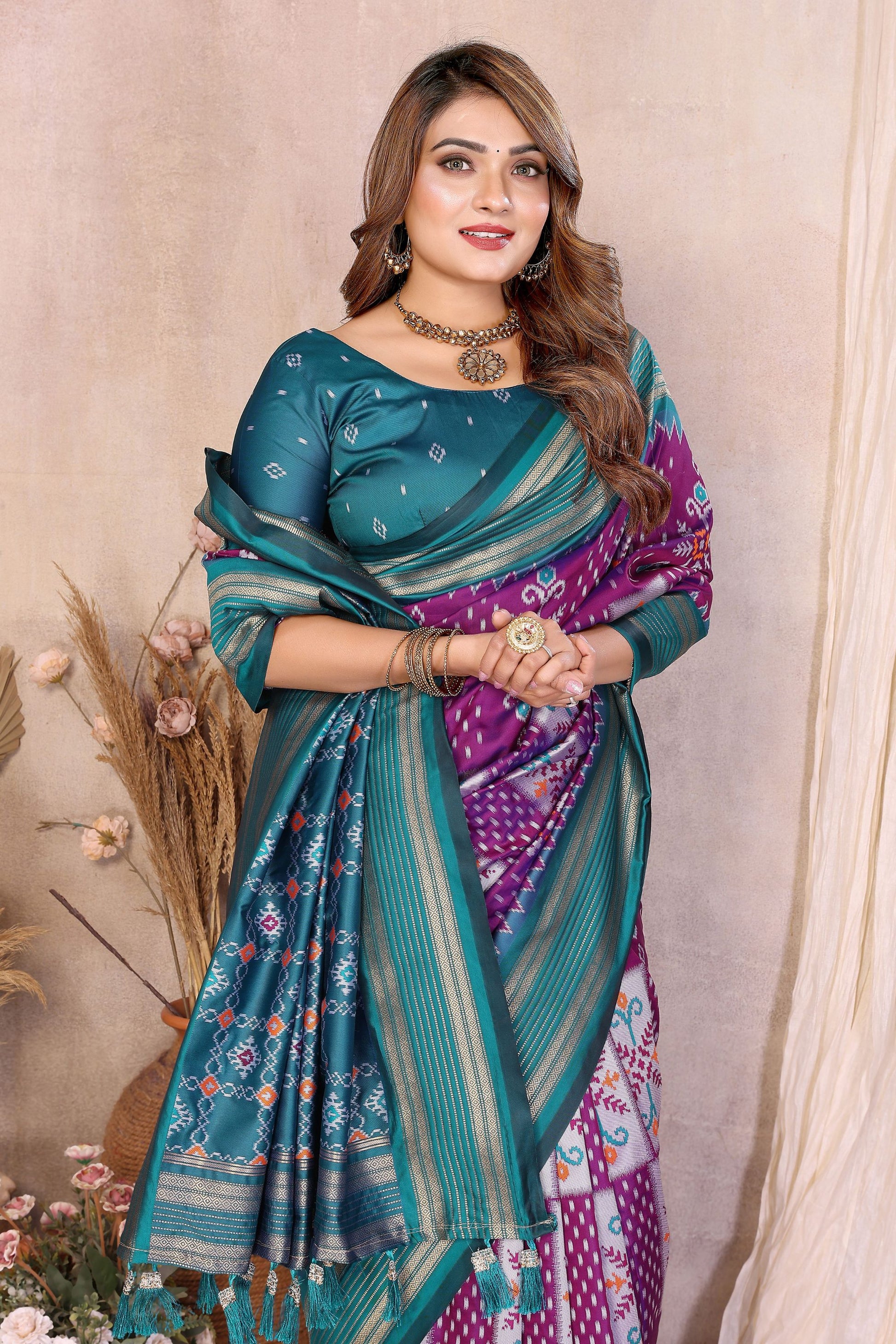 Add timeless charm to your ethnic wardrobe with this elegant Purple And Teal Ikat Silk Saree with Traditional Weaving Saree  beautifully crafted with traditional handloom-inspired weaving. Featuring classic geometric and Ikat patterns, this saree showcases a rich blend of colors enhanced by a contrasting teal border and intricately designed pallu with tassel detailing. Made from premium silk fabric, this saree offers a soft texture, graceful drape, and luxurious appeal. The contemporary yet traditional design makes it a perfect choice for women who love cultural elegance with a modern touch. Paired with a matching unstitched blouse piece, it is ideal for festive occasions, office ethnic wear, cultural events, poojas, and casual celebrations.