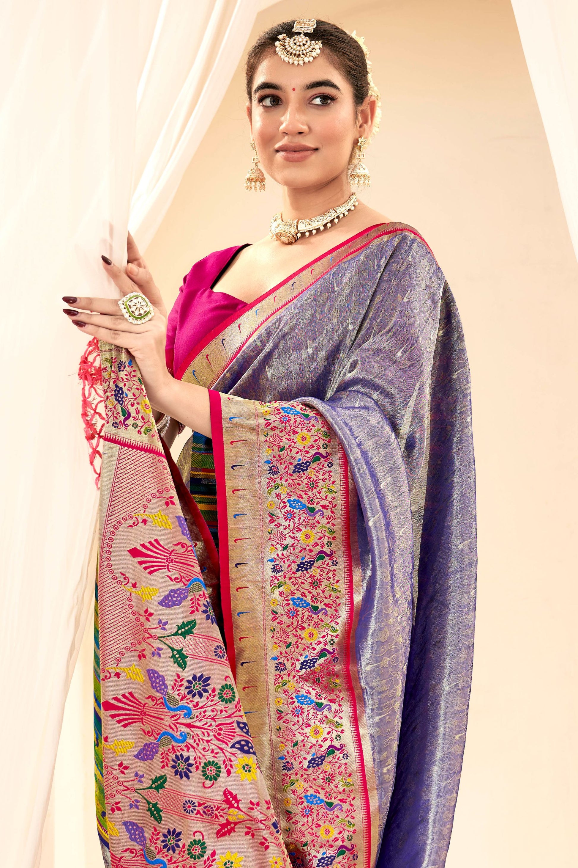 Purple Banarasi Silk Saree with Pink Zari Border Wedding and Festive Wear