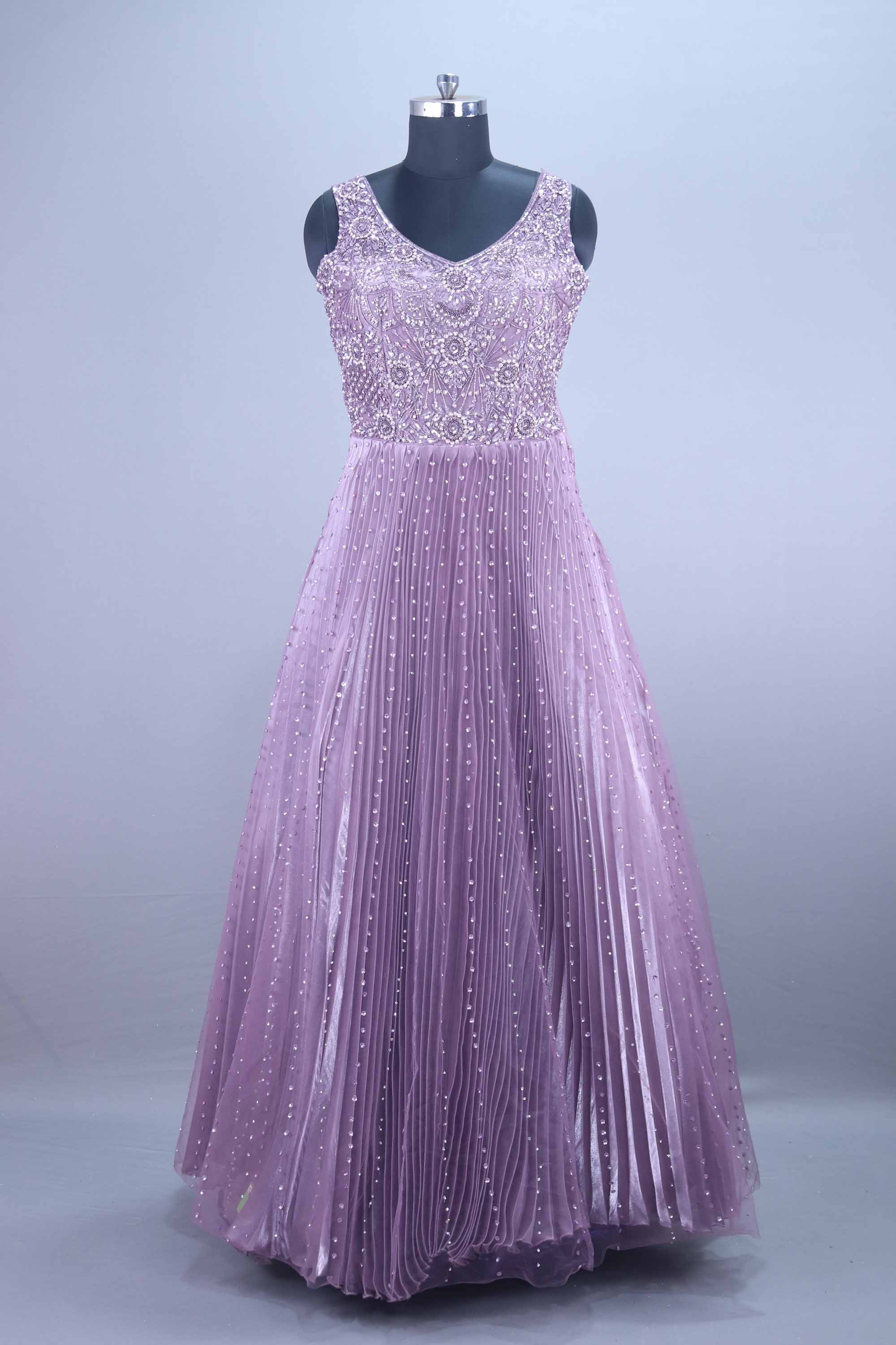 Designed in a soft, Purple Heavy Embroidered Pleated Net Gown with Dupatta a richly embellished bodice adorned with intricate floral embroidery and shimmering sequins. The flowing pleated net skirt adds graceful movement, while the lightweight matching dupatta completes the look with a delicate, ethereal touch. Perfect for receptions, sangeet nights, engagement ceremonies, cocktail parties, and festive celebrations, this gown combines luxury, comfort, and contemporary style. The flattering sleeveless design and fine craftsmanship make it an ideal choice for women who love modern glamour with traditional elegance.