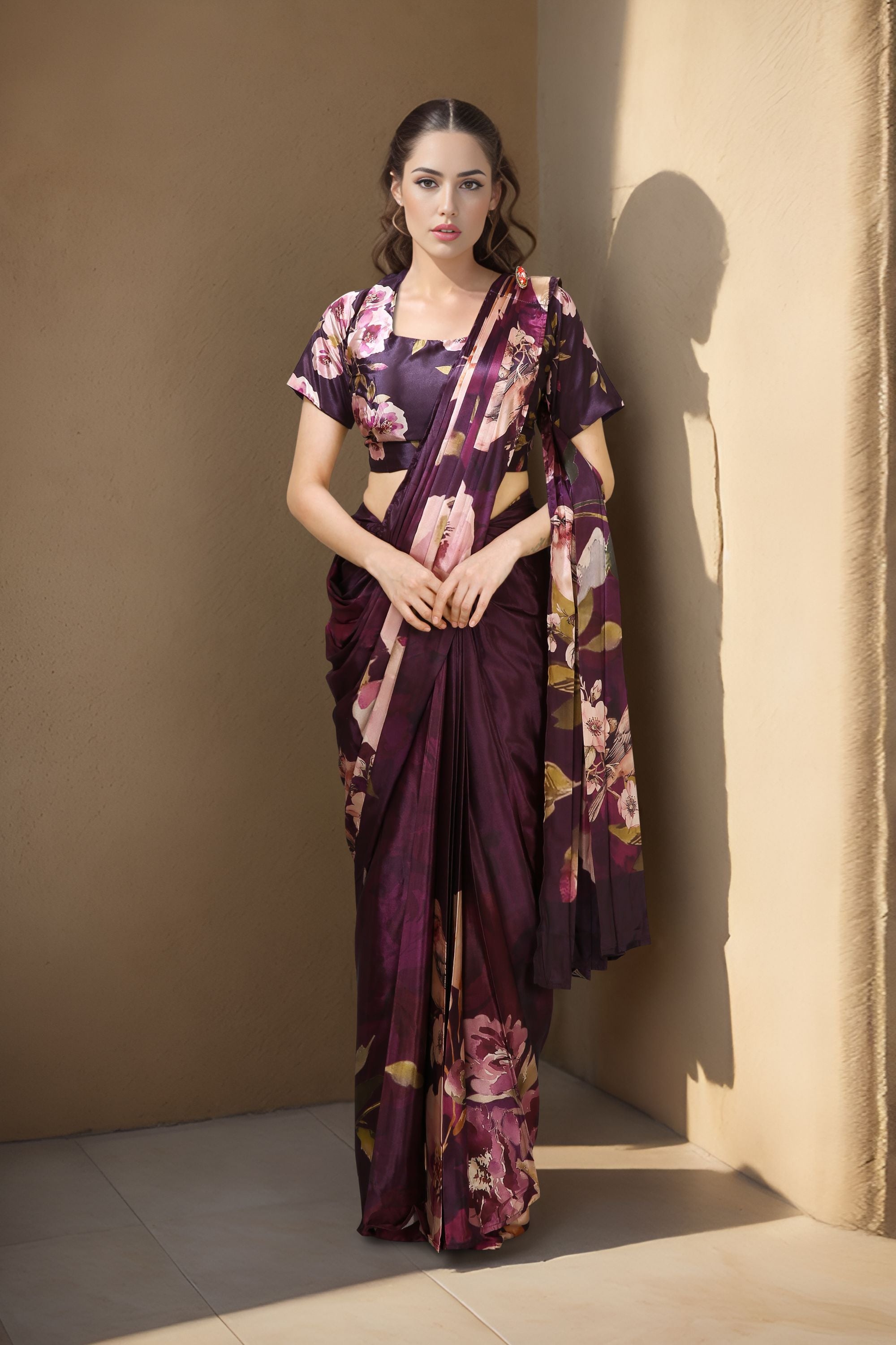 Elevate your ethnic wardrobe with this stunning Purple Satin Floral Printed Saree with Matching Blouse Party Wear , designed to add elegance and modern charm to every occasion. Crafted from premium satin silk fabric, this saree offers a luxurious shine, soft texture, and effortless drape that beautifully enhances your silhouette. The rich wine shade paired with delicate floral prints in pastel tones creates a timeless and feminine look. Paired with a matching stitched blouse featuring short sleeves and a stylish neckline, this saree is perfect for women who love subtle glamour with a contemporary twist.