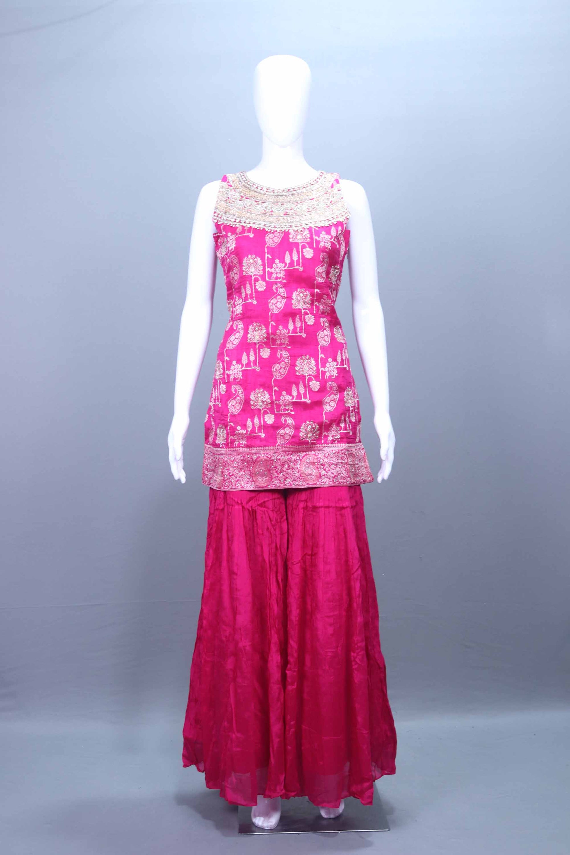 Rani Pink Printed Kurti with Ruffle Cape and Sharara Set Festive Wear