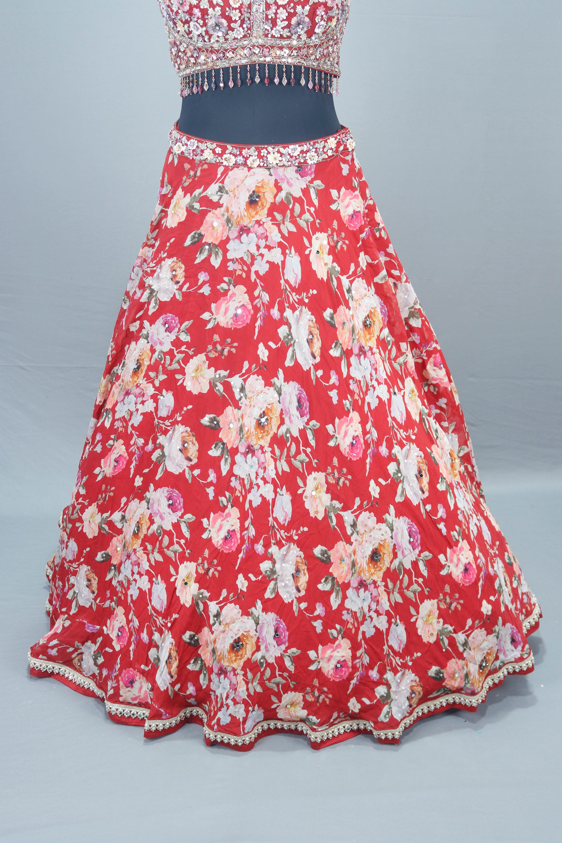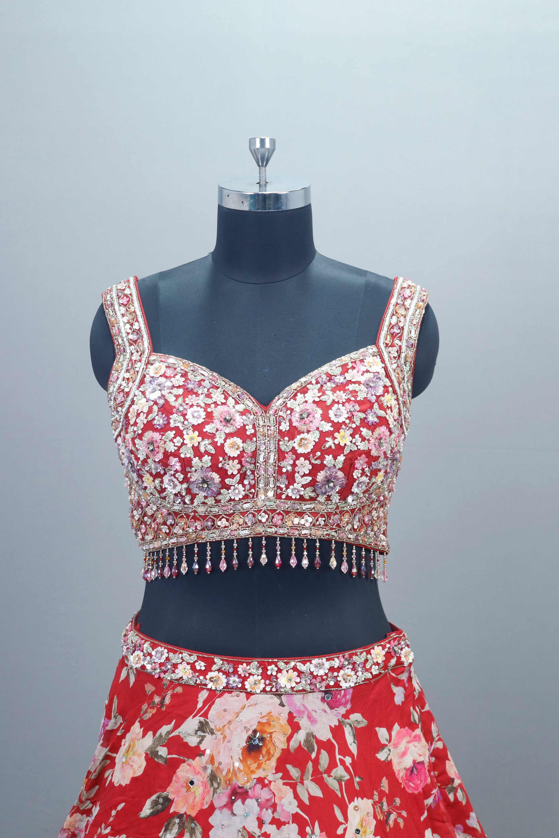 Turn heads at every occasion with this gorgeous Red Lehenga Choli Blouse Net Dupatta Designer Party Wear. The lehenga features a bold red base adorned with multi-color floral prints, exuding charm and elegance. The sweetheart neckline blouse is heavily embellished with sequins and beadwork, enhanced with trendy tassel detailing. Paired with a contrasting orange net dupatta embellished with delicate borders, this designer lehenga is perfect for weddings, sangeet, festive celebrations, and parties. Crafted from premium fabric, this lightweight lehenga offers comfort and style, making it a must-have for your ethnic wardrobe.