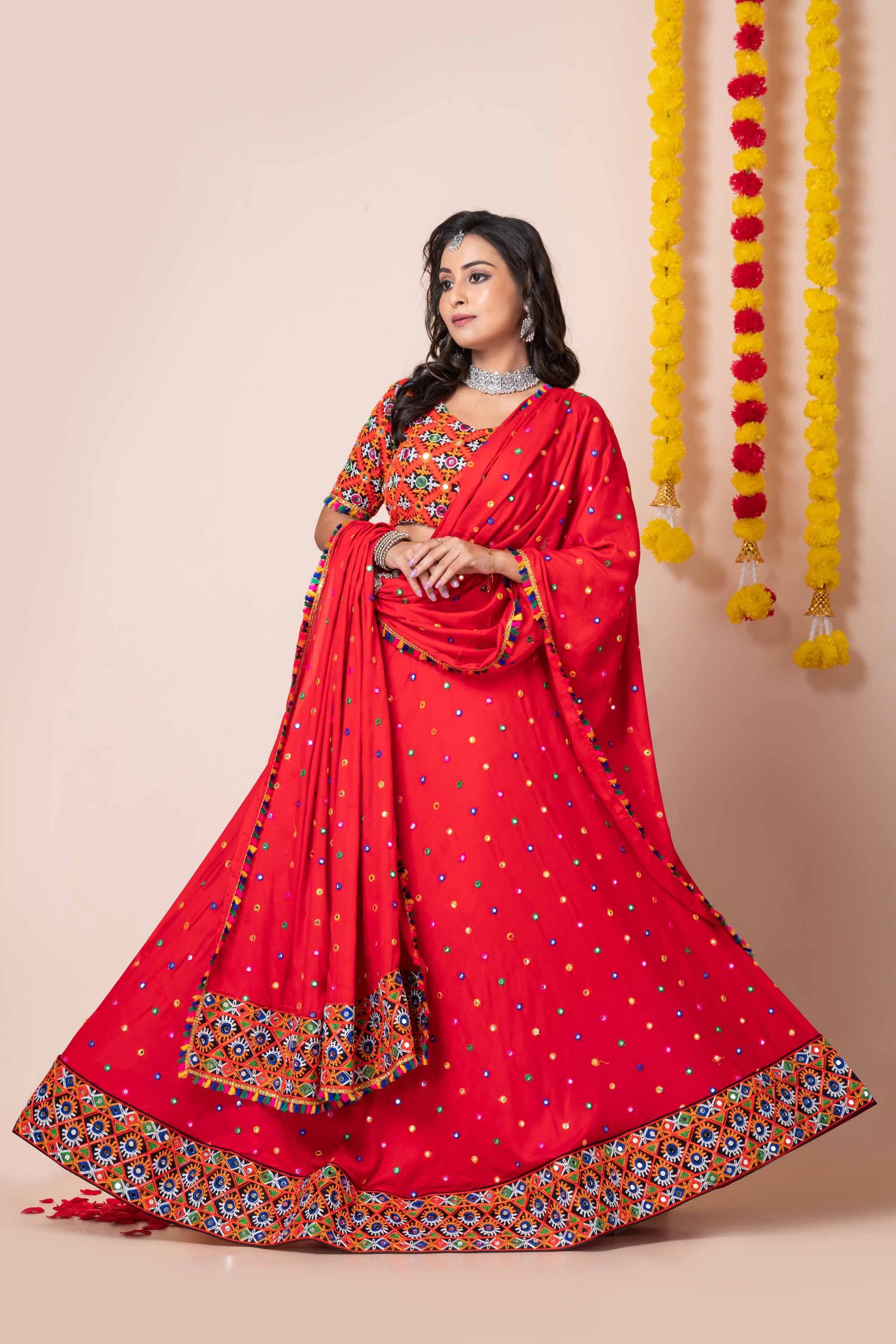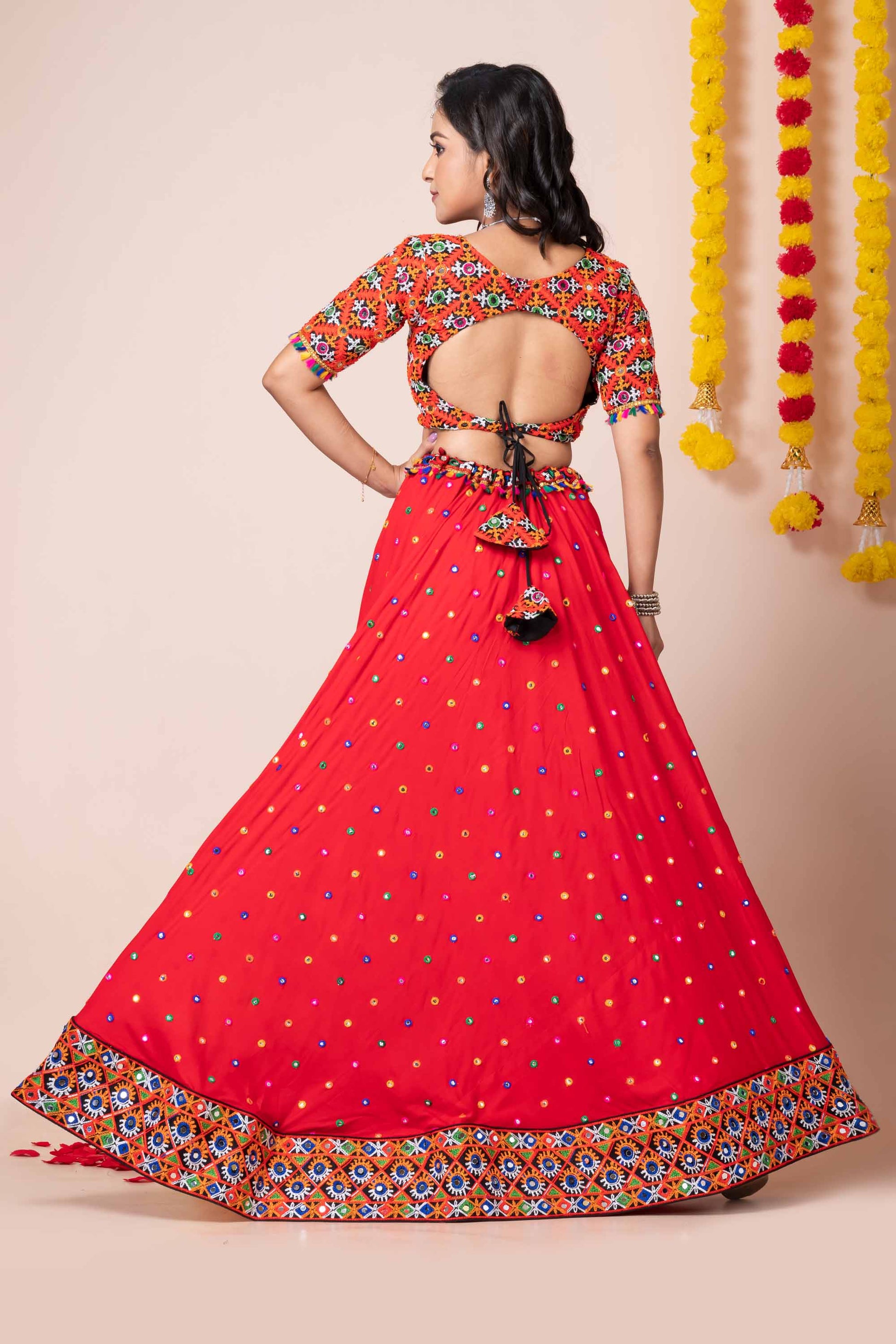 Red Navratri Lehenga Choli with Multicolor Mirror and Thread Embroidery for Garba
