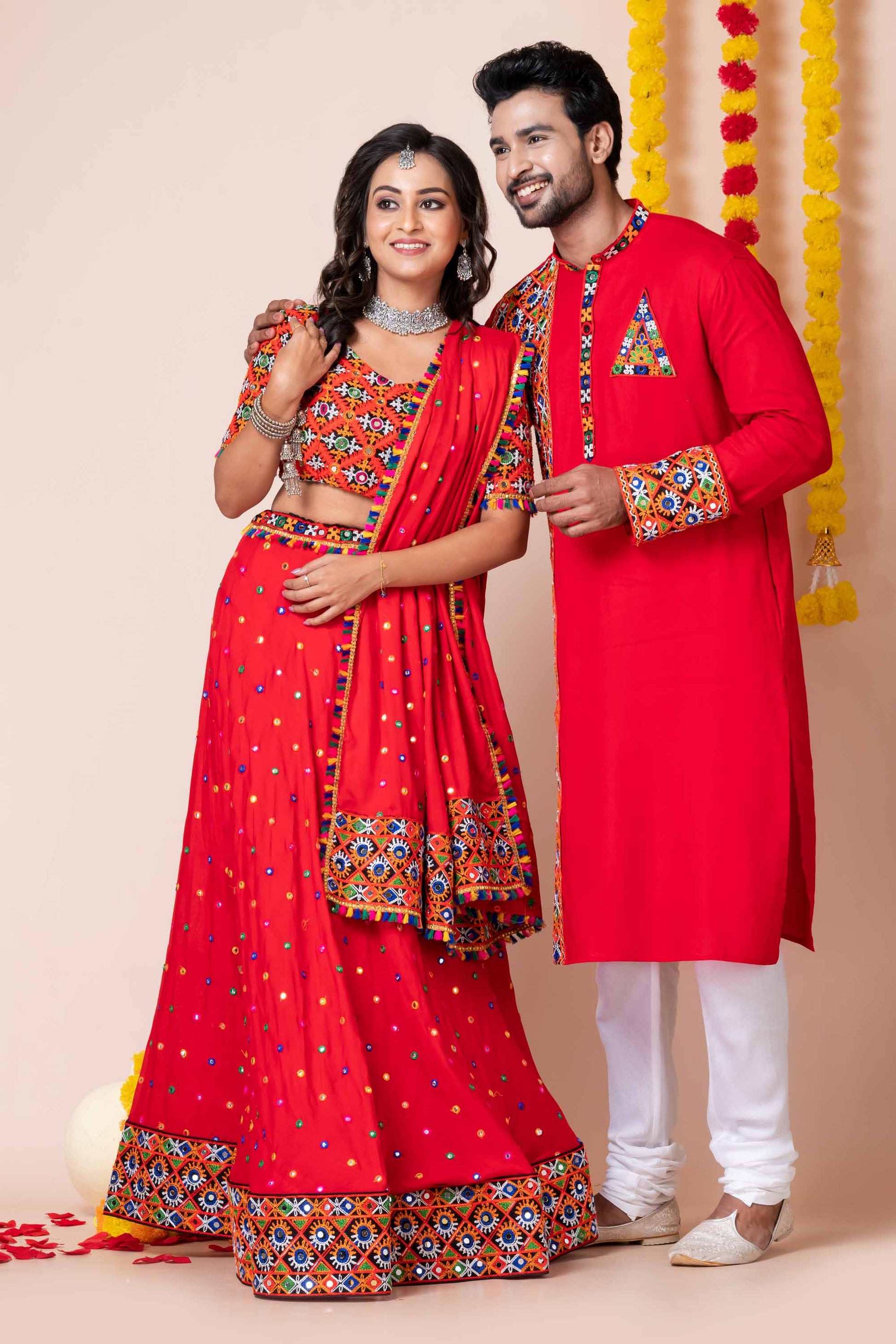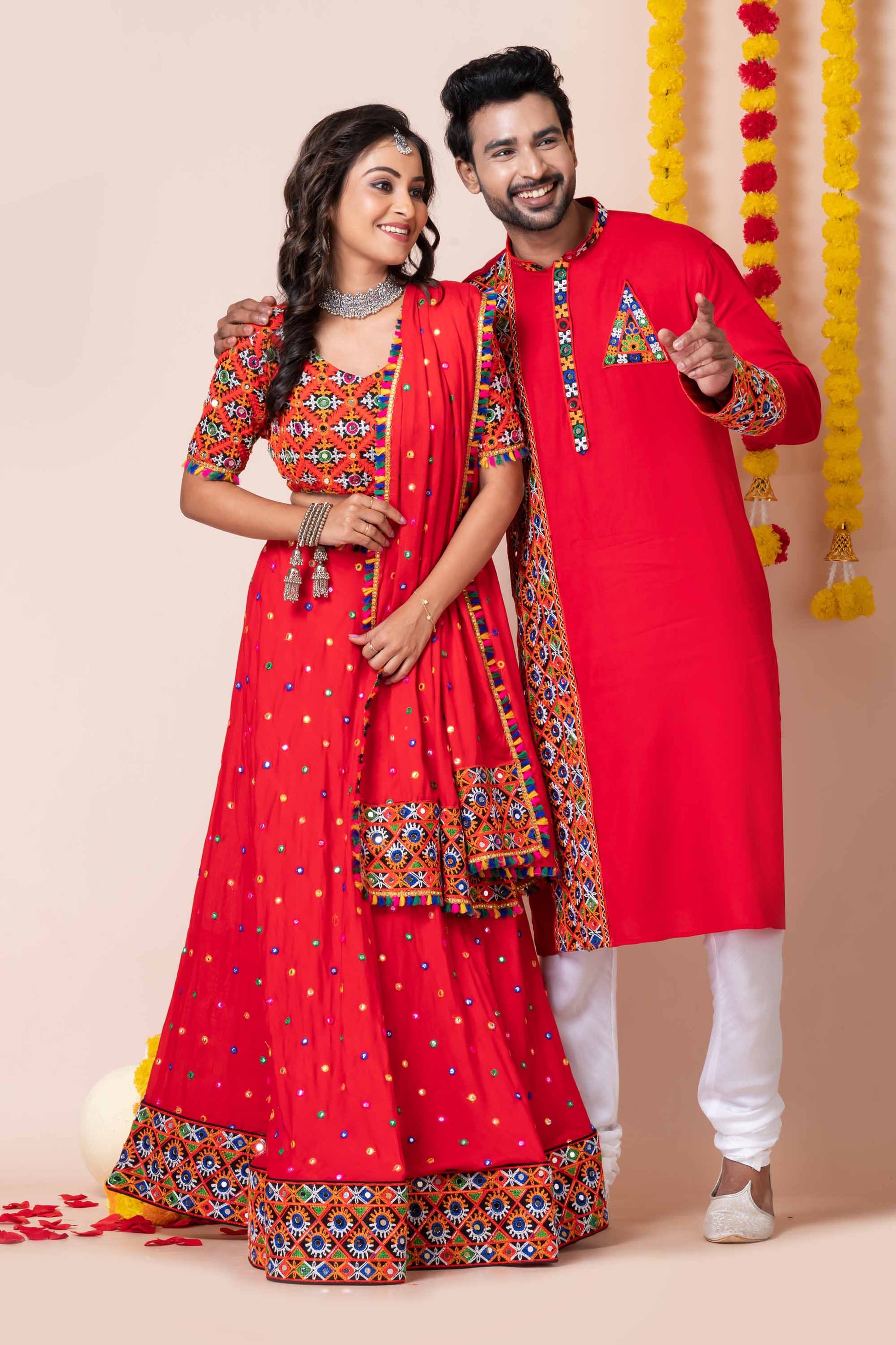 Show off your festive flair as a couple with this stunning Red Rayon Navratri Outfit Set, designed with traditional Kutchi mirror and thread embroidery. This coordinated ensemble is perfect for Garba nights, Dandiya events, and festive photo moments that reflect rich cultural heritage. The women's lehenga choli features an all-over multicolor mirror design with heavy embroidered borders and tassel accents, paired with a matching dupatta. The men's kurta complements it beautifully with an embroidered panel, placket, cuffs, and triangle chest patch, making this set a true celebration of unity in tradition.