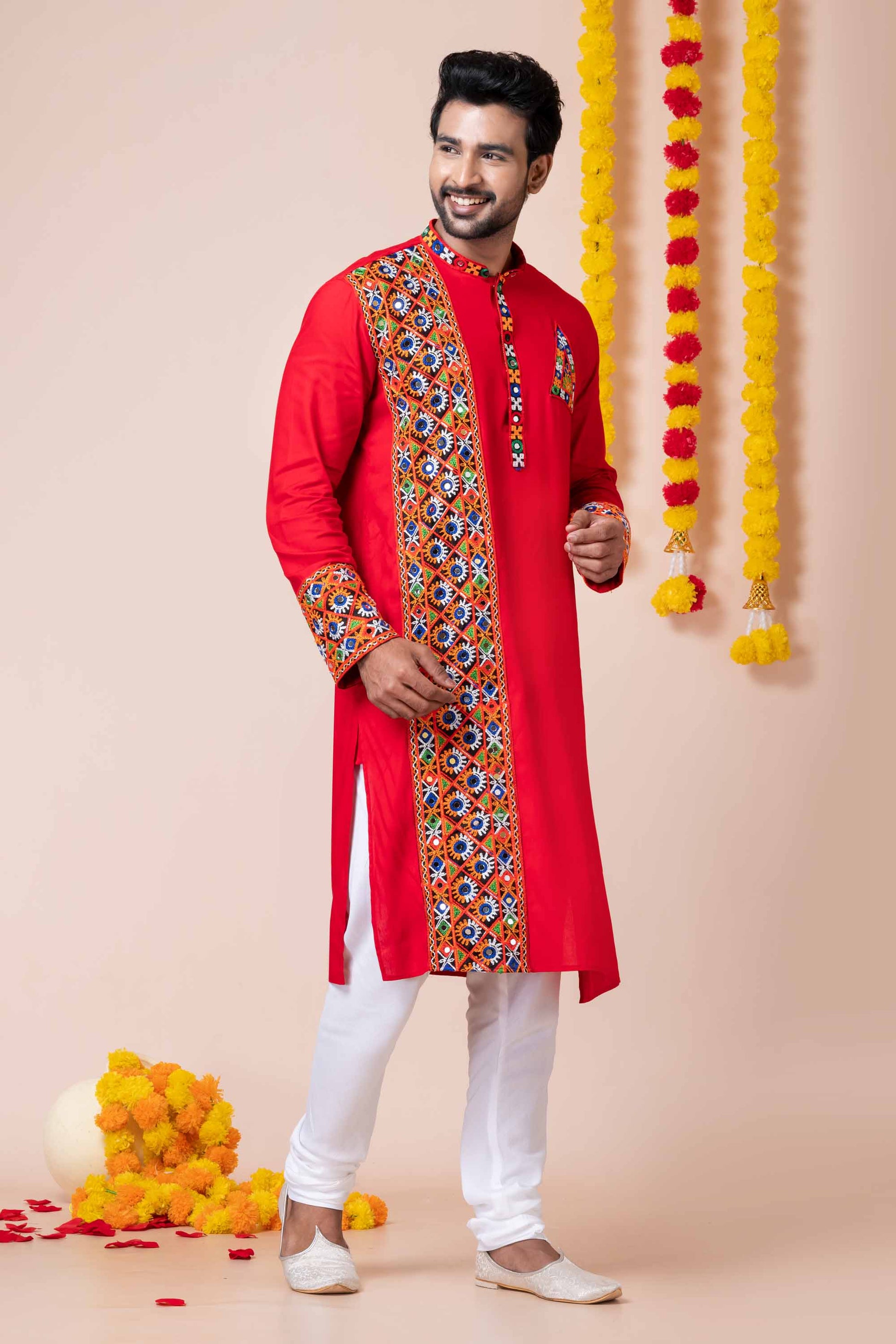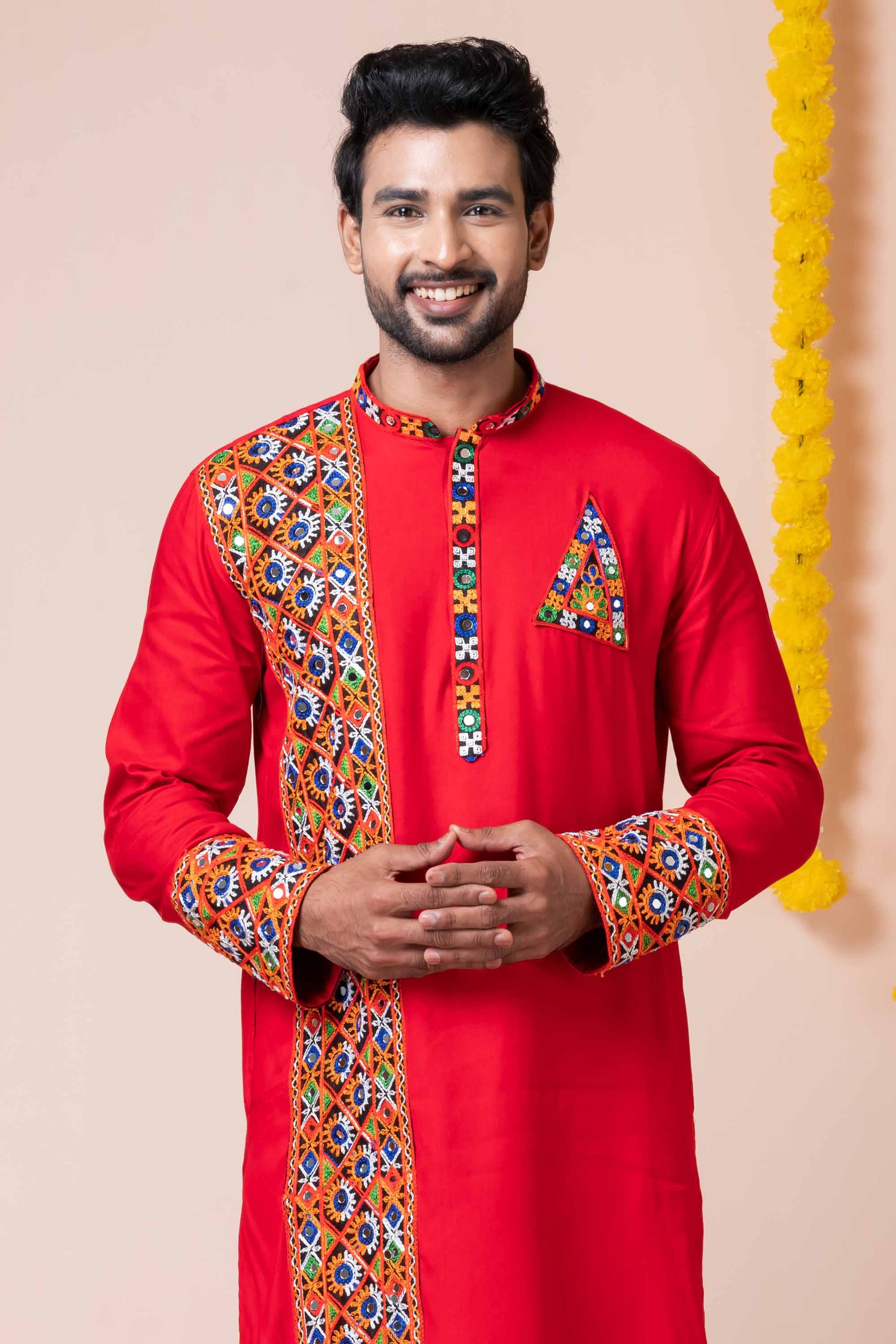 Make a bold statement this festive season with this Men's Red Rayon Kurta featuring Multicolor Mirror and Thread Embroidery, designed especially for Navratri and Garba nights. Crafted from breathable cotton fabric, this kurta ensures both style and comfort. The vibrant embroidery across the chest, cuffs, and placket showcases traditional craftsmanship with a modern touch, making it a perfect ethnic wear choice for cultural celebrations.