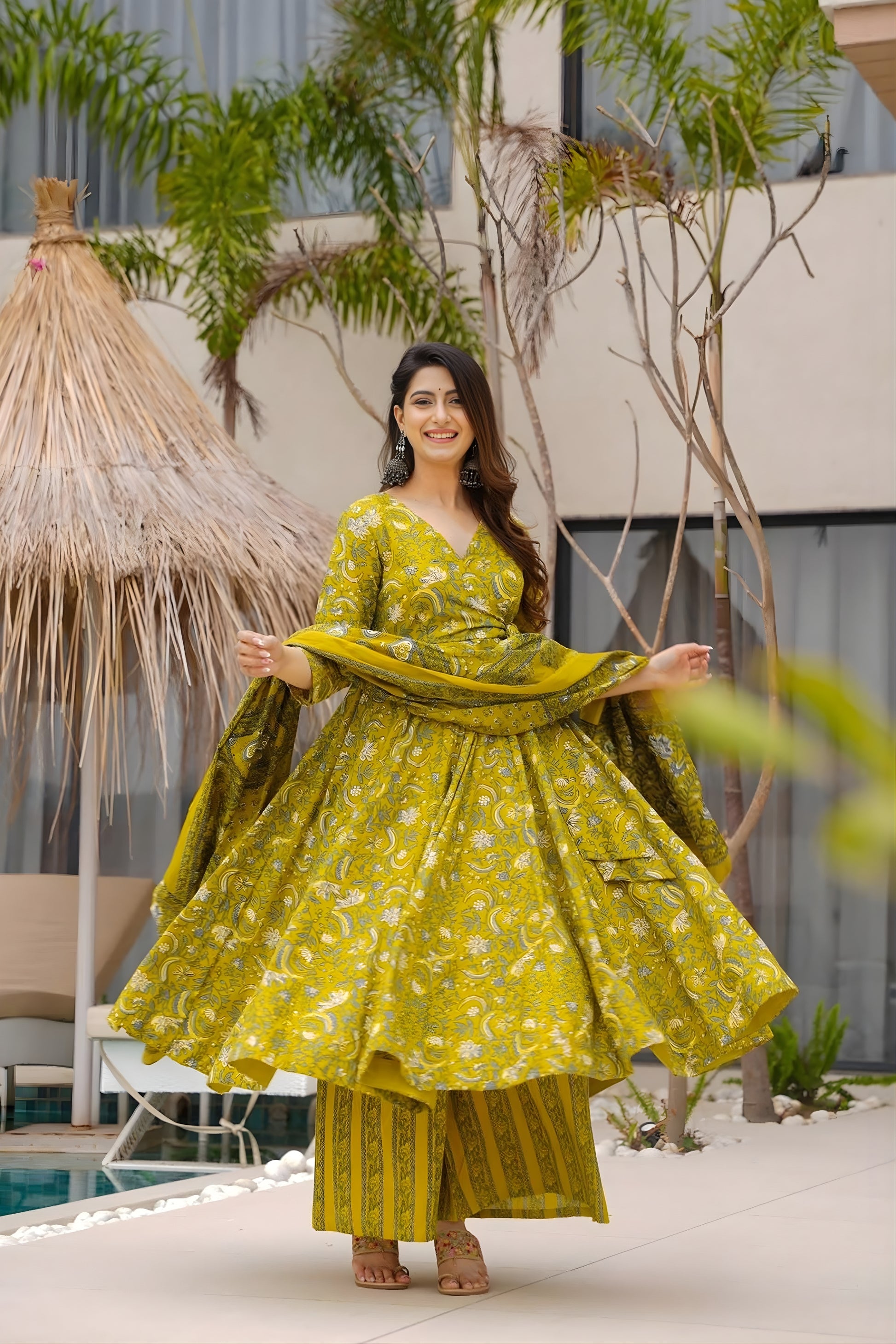 Add a vibrant touch to your ethnic collection with this stunning Lime Green Muslin Digital Printed Anarkali Salwar Suit Set, designed to offer graceful movement and modern elegance. Crafted from premium-quality muslin fabric, this outfit is soft, breathable, and lightweight—perfect for festive celebrations, wedding functions, and traditional gatherings. The beautifully flared Anarkali silhouette enhances your overall look with a flattering fit and rich flow. The intricate digital ethnic print adds detailed artistry to the refreshing lime green base, creating a bold yet sophisticated appearance. The coordinated bottom and matching dupatta complete the ensemble, delivering a well-balanced and polished ethnic outfit.
