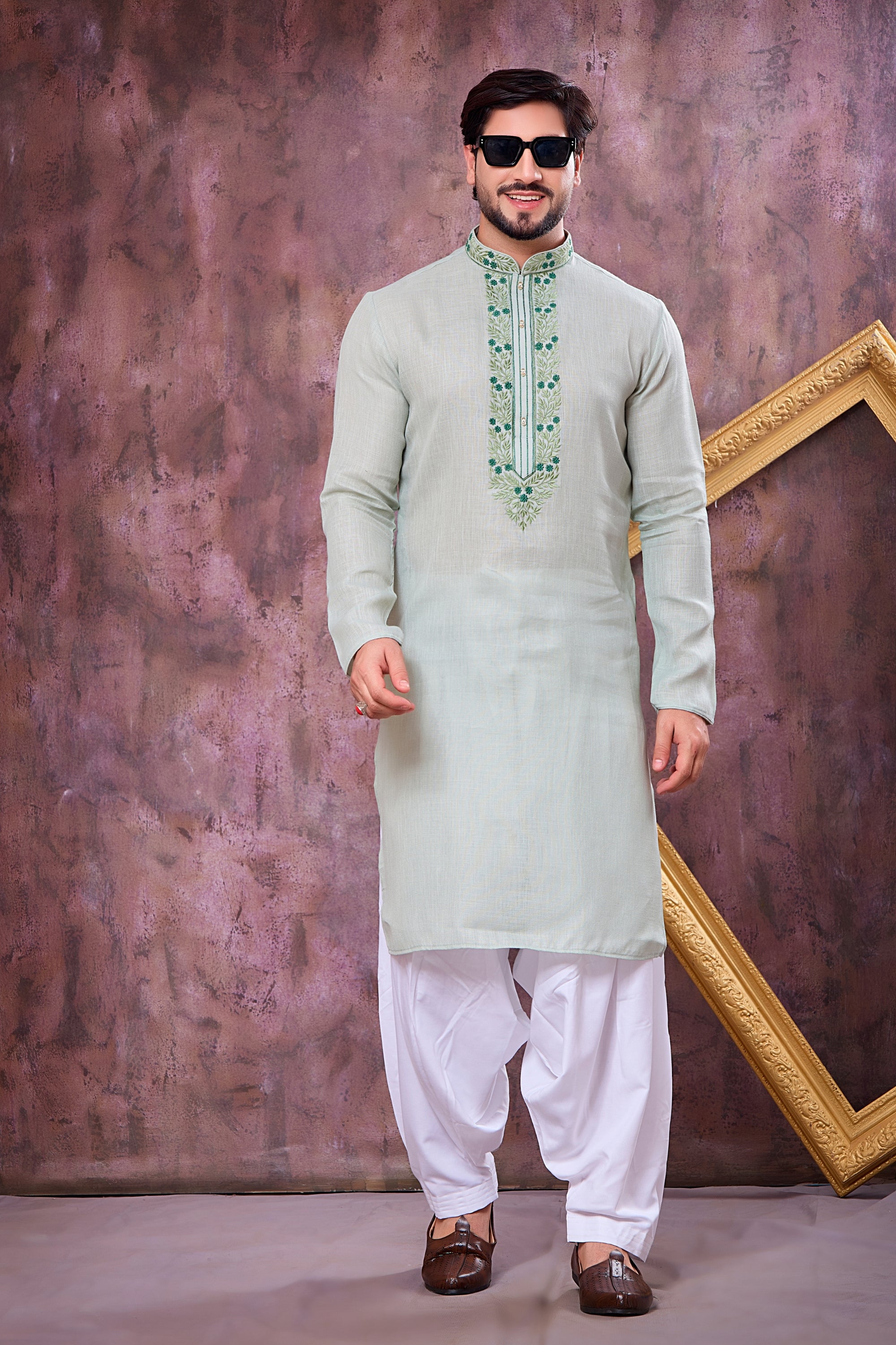 Refreshing Mint Green Cotton Embroidered Patiyala Style Kurta Pyjama Set for Men