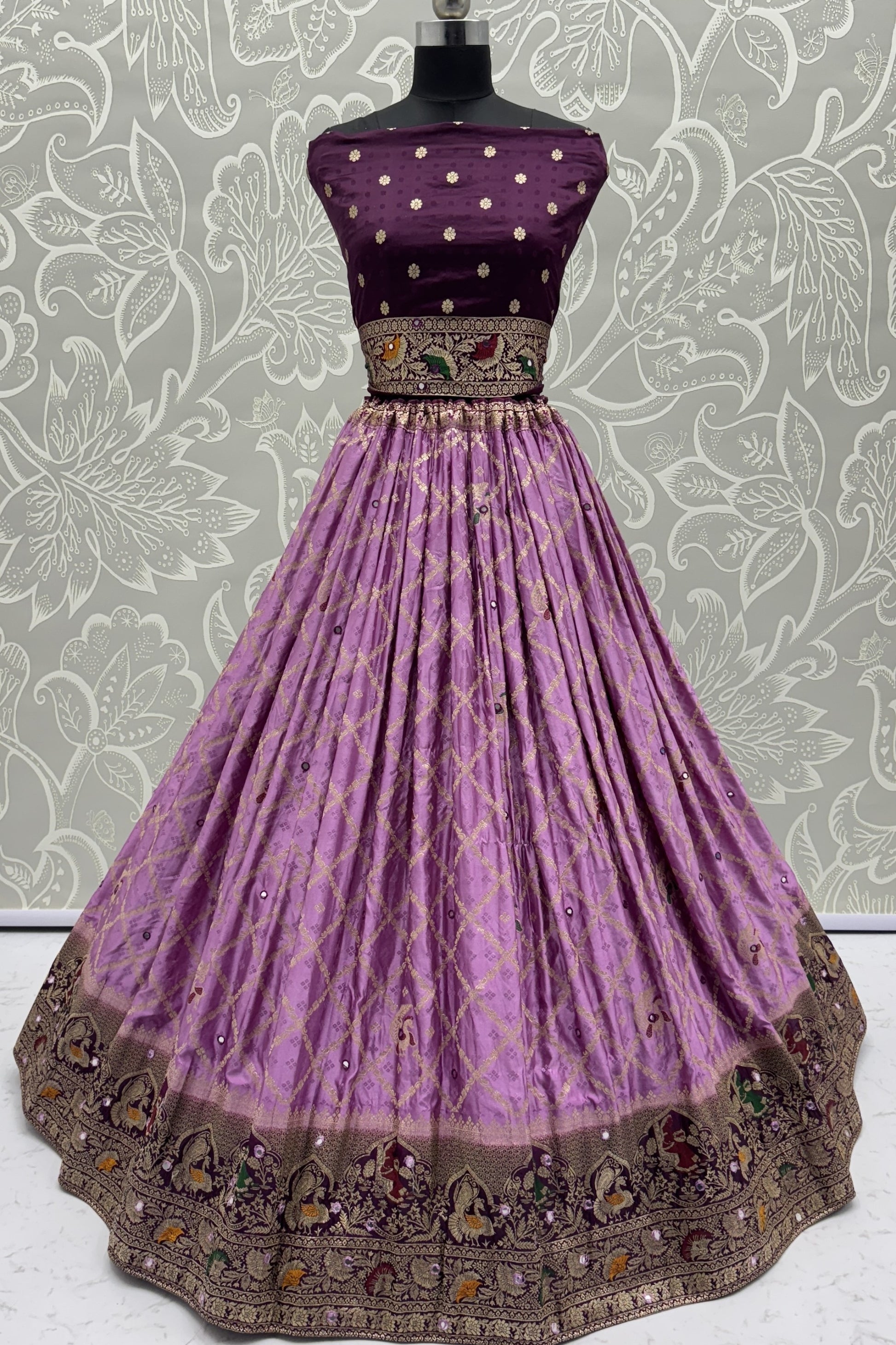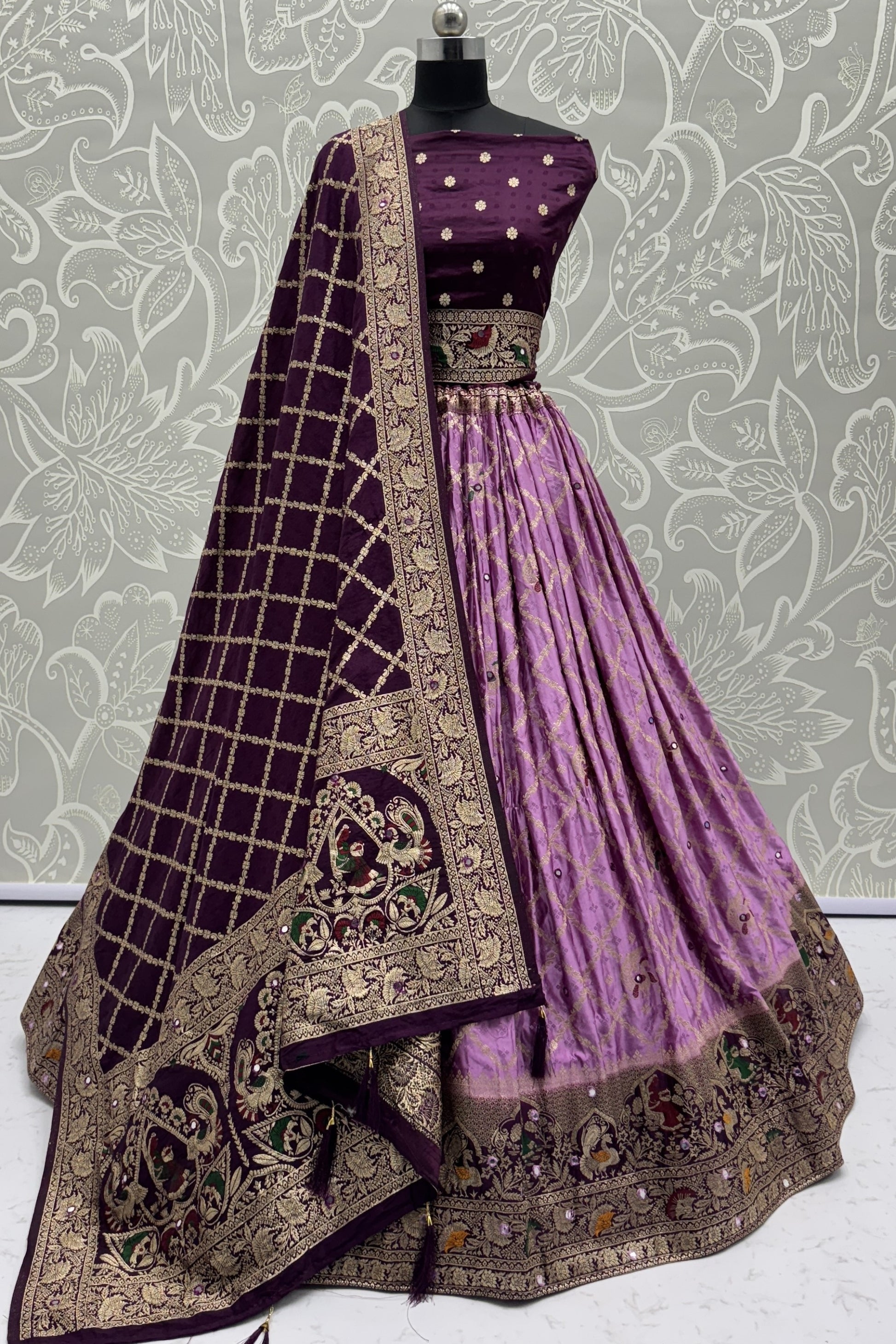 Make a majestic statement on your big day with this Regal Purple and Pink Georgette Bridal Lehenga Choli. Crafted from premium art silk, this luxurious ensemble features a richly embroidered lavender lehenga adorned with intricate golden zari and resham thread work. The matching purple blouse is embellished with delicate motifs, while the heavily bordered dupatta showcases traditional peacock and floral designs in multicolor resham, mirror, and zari embroidery. Perfect for weddings, receptions, or grand festive occasions, this lehenga choli set blends royal charm with cultural heritage. The broad embroidered waistband enhances the silhouette, making it a timeless bridal choice.