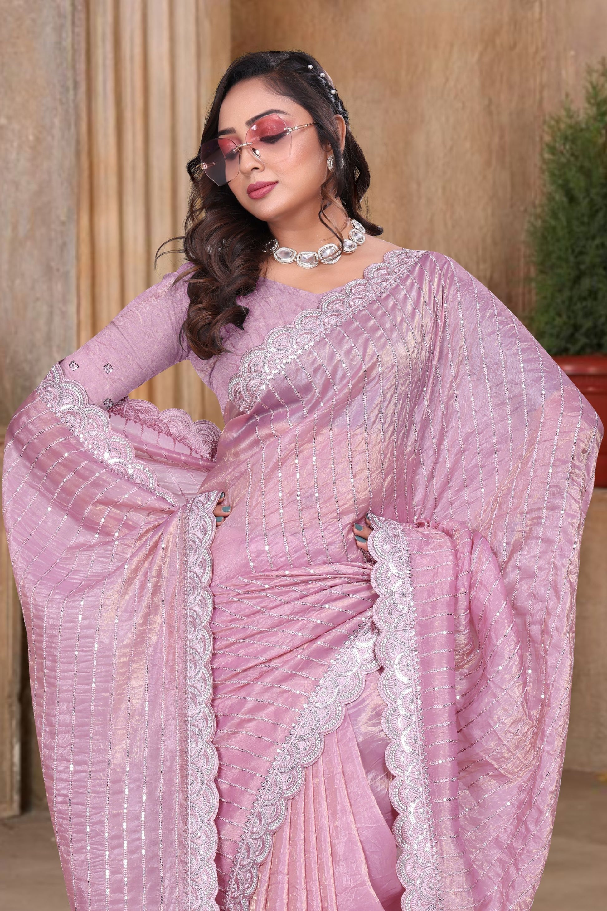 Rose Pink Sequin Embroidered Gold Crush Saree with Designer Blouse