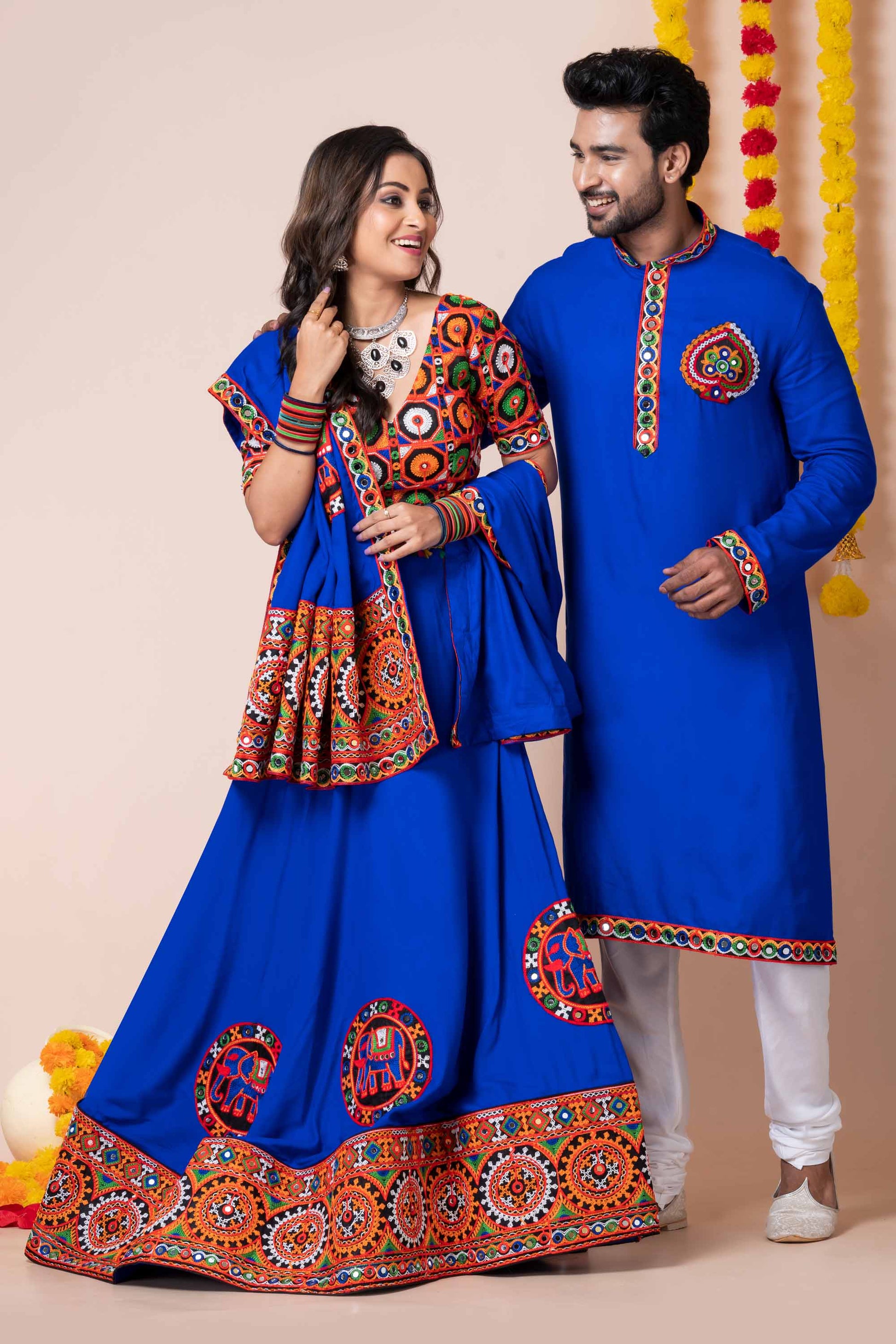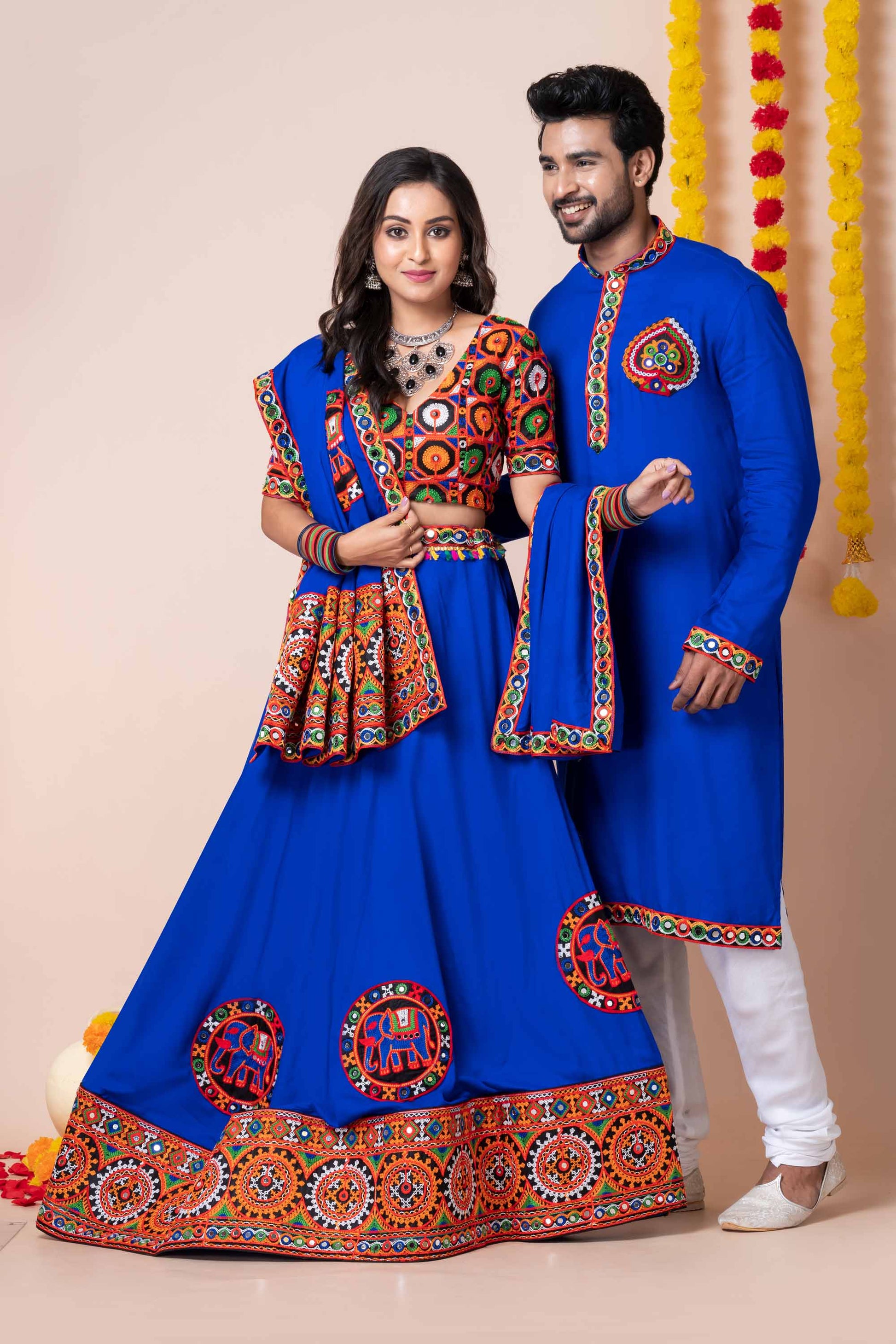 Celebrate Navratri in vibrant harmony with this Royal Blue Rayon Couple Outfit, intricately adorned with multicolor Kutchi mirror work and traditional elephant embroidery. The women's lehenga choli features exquisite threadwork and mirror embellishments, while the men's kurta complements perfectly with matching embroidered details. Crafted from soft, breathable rayon fabric, this festive ensemble offers comfort and style for long Garba and Dandiya nights. Ideal for Navratri, Garba, and other traditional occasions, this couple set blends heritage craftsmanship with modern flair.