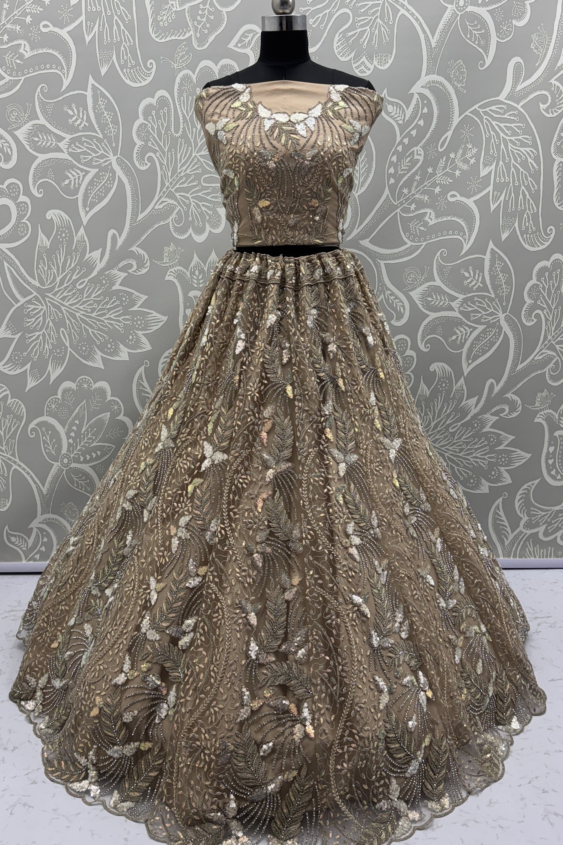 Drape yourself in opulence with this Royal Golden Net Bridal Lehenga Choli, designed to make a lasting impression on your special day. Crafted from soft net fabric, this elegant lehenga features intricate thread embroidery, shimmering sequin work, and delicate floral motifs throughout the flare and blouse. The coordinating net dupatta is finished with a detailed embroidered border, adding a touch of regal grace to the ensemble. This designer lehenga choli set is perfect for weddings, receptions, sangeet nights, or luxury festive celebrations. Its light-reflective finish and champagne hue make it a glamorous yet graceful bridal choice.