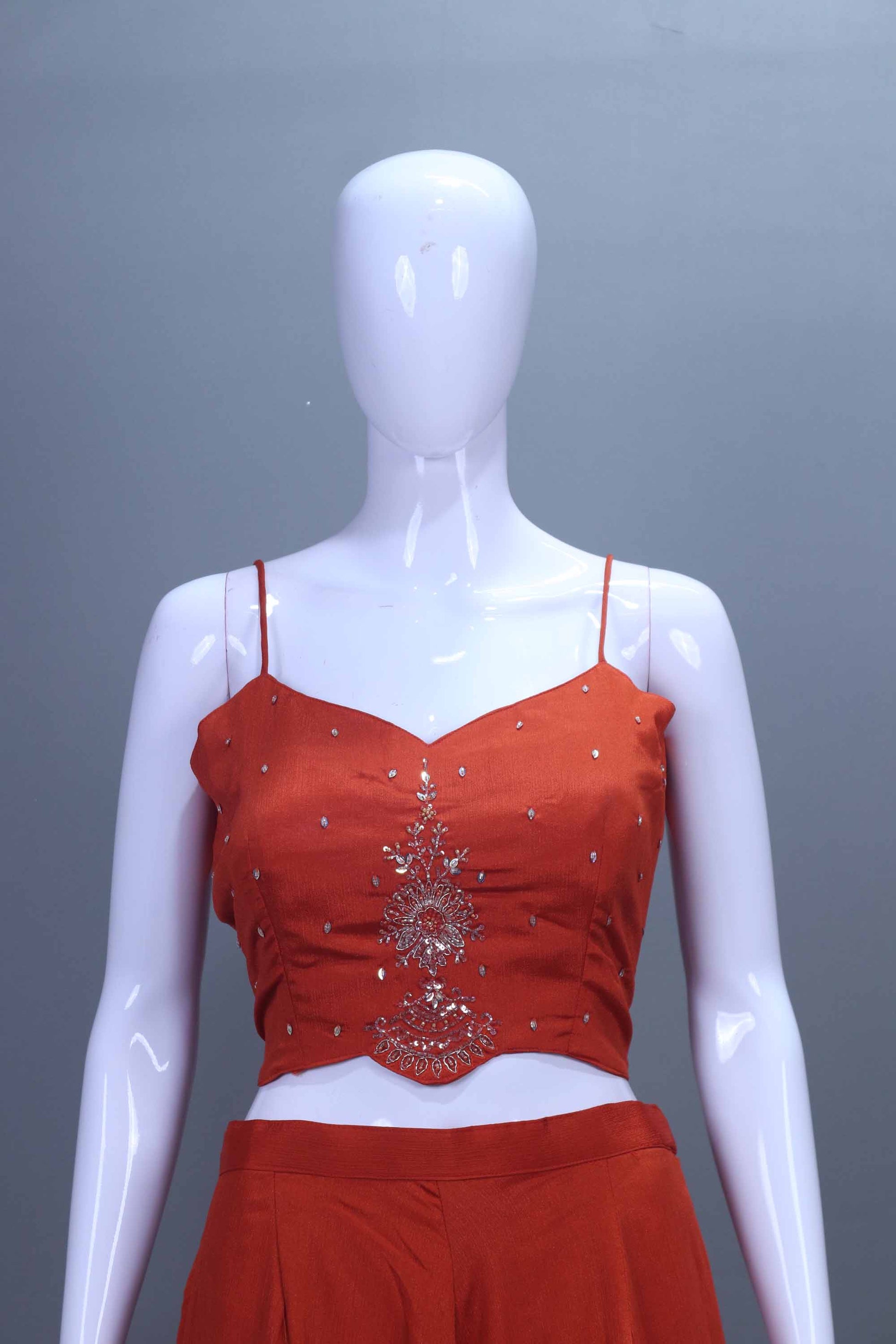 Elevate your ethnic wardrobe with this stunning Rust Orange Embroidered Three-Piece Indo Western Set with Long Jacket a beautifully embroidered crop top, a layered flowy skirt, and a matching long jacket perfect for festive celebrations, weddings, or special occasions. The intricate embroidery on the jacket and top adds a touch of traditional charm, while the contemporary silhouette offers modern sophistication. Crafted from high-quality, breathable fabric, this outfit ensures all-day comfort and effortless grace. Style it with statement jewelry and heels to complete your festive look.