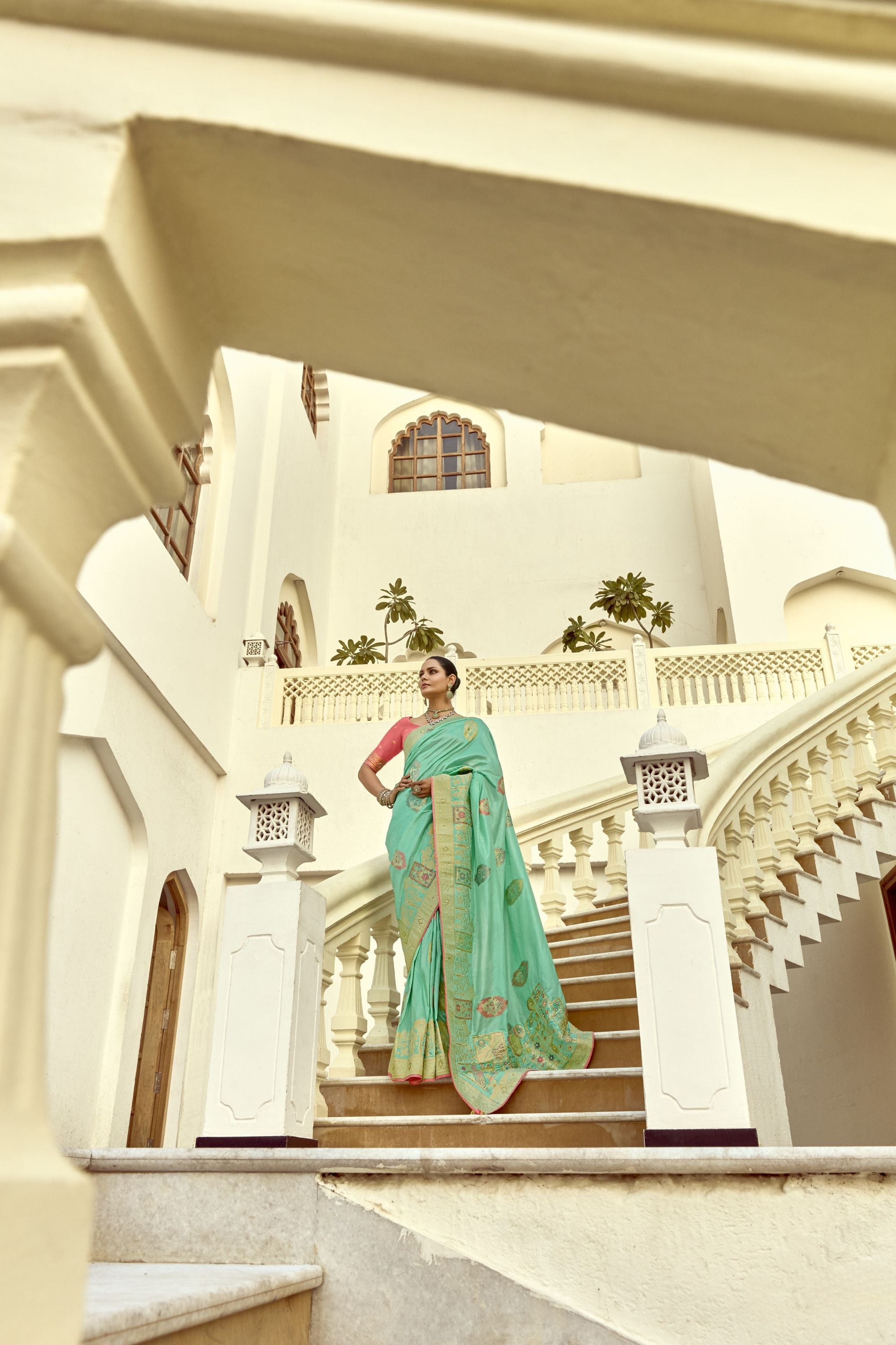Elevate your ethnic style with this stunning Sea Green Silk Saree with Antique Gold Zari Motifs Contrast Pink Blouse , crafted to reflect timeless elegance and traditional craftsmanship. Made from premium-quality silk fabric, this saree offers a smooth texture, rich sheen, and graceful drape perfect for weddings, festive celebrations, traditional functions, and special occasions. The saree is beautifully adorned with antique gold zari motifs and intricate woven detailing, enhanced by a richly designed zari border that adds a regal finish. Paired with a striking contrast pink blouse, this saree creates a perfect balance of classic charm and contemporary appeal. Ideal for women who appreciate heritage inspired fashion with modern sophistication, this designer silk saree is a must-have for grand celebrations.