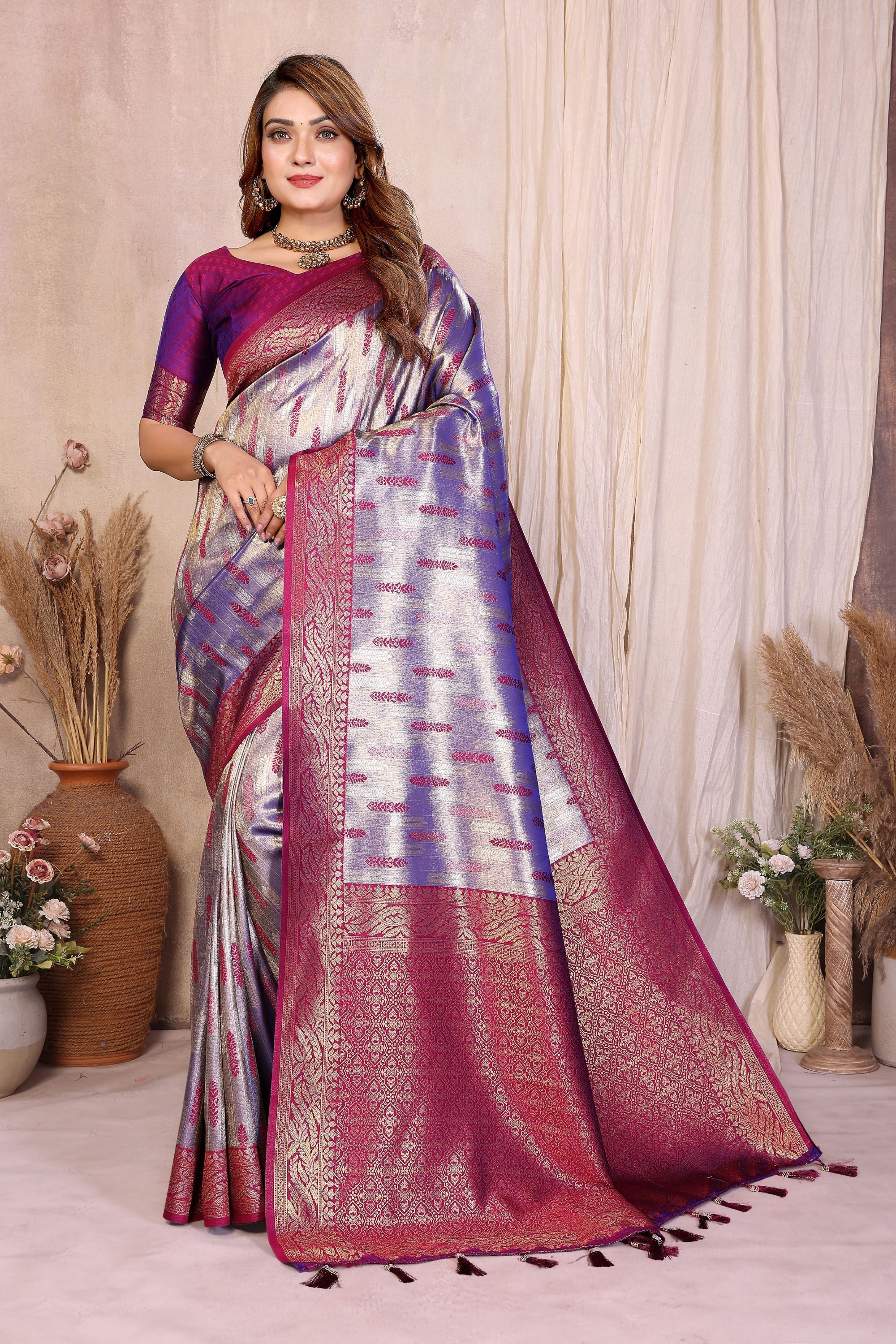 Elevate your ethnic wardrobe with this stunning Silver Purple Banarasi Silk Saree with Rich Zari Weaving and Contrast Pallu  designed to bring a perfect blend of luxury, tradition, and elegance. Crafted from premium soft silk, this saree features a radiant silver body beautifully complemented by intricate magenta zari motifs that enhance its royal charm. The rich woven Banarasi border and pallu showcase exquisite craftsmanship, adding a timeless touch to your festive and wedding looks. The saree drapes gracefully, offering both comfort and a regal appeal, making it ideal for weddings, receptions, festivals, parties, and traditional celebrations. Paired with a contrasting magenta blouse, this attire ensures you stand out with sophistication and cultural beauty.