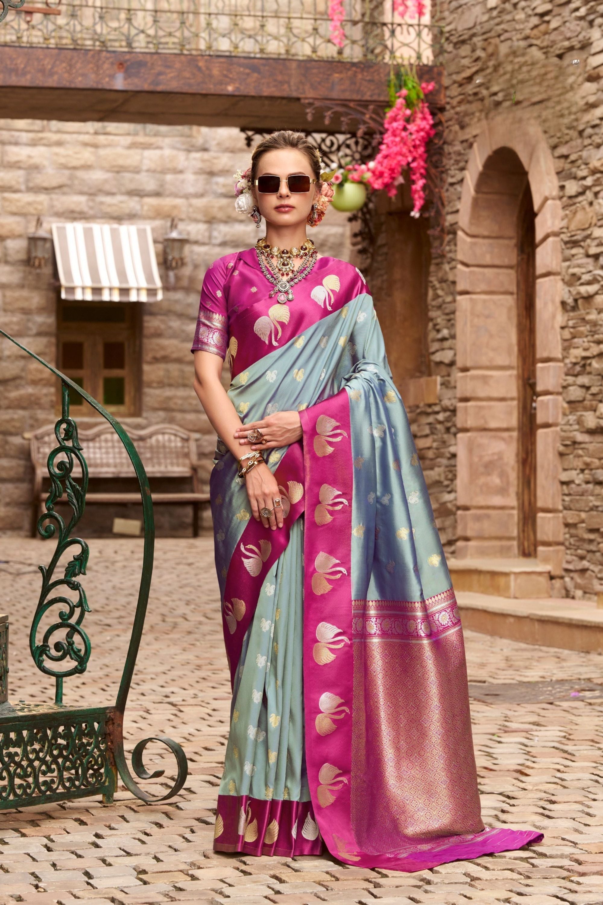 Sky Blue And Magenta with Gold Zari Motifs and Rich Border