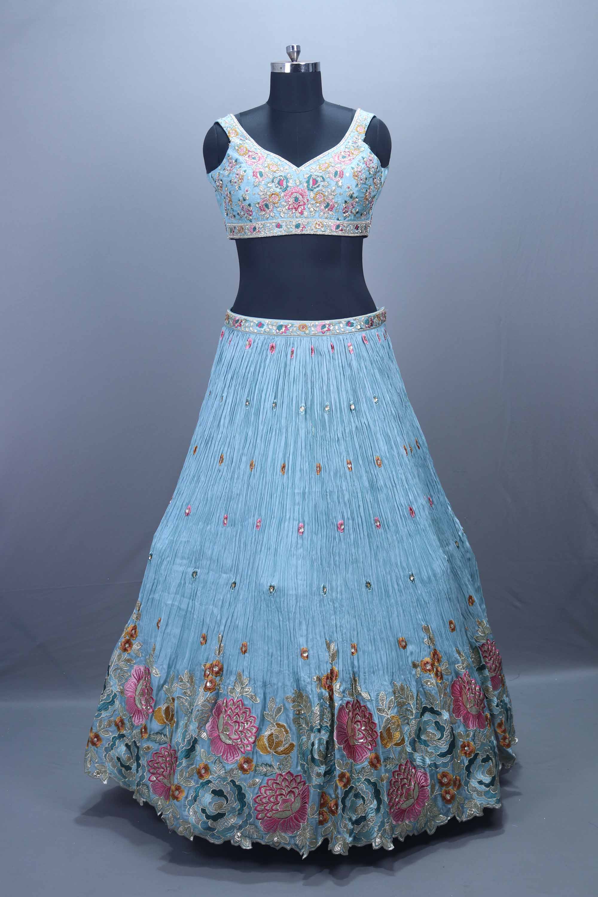 Sky Blue Heavy Embroidered Lehenga Choli with Floral Thread Work Dupatta