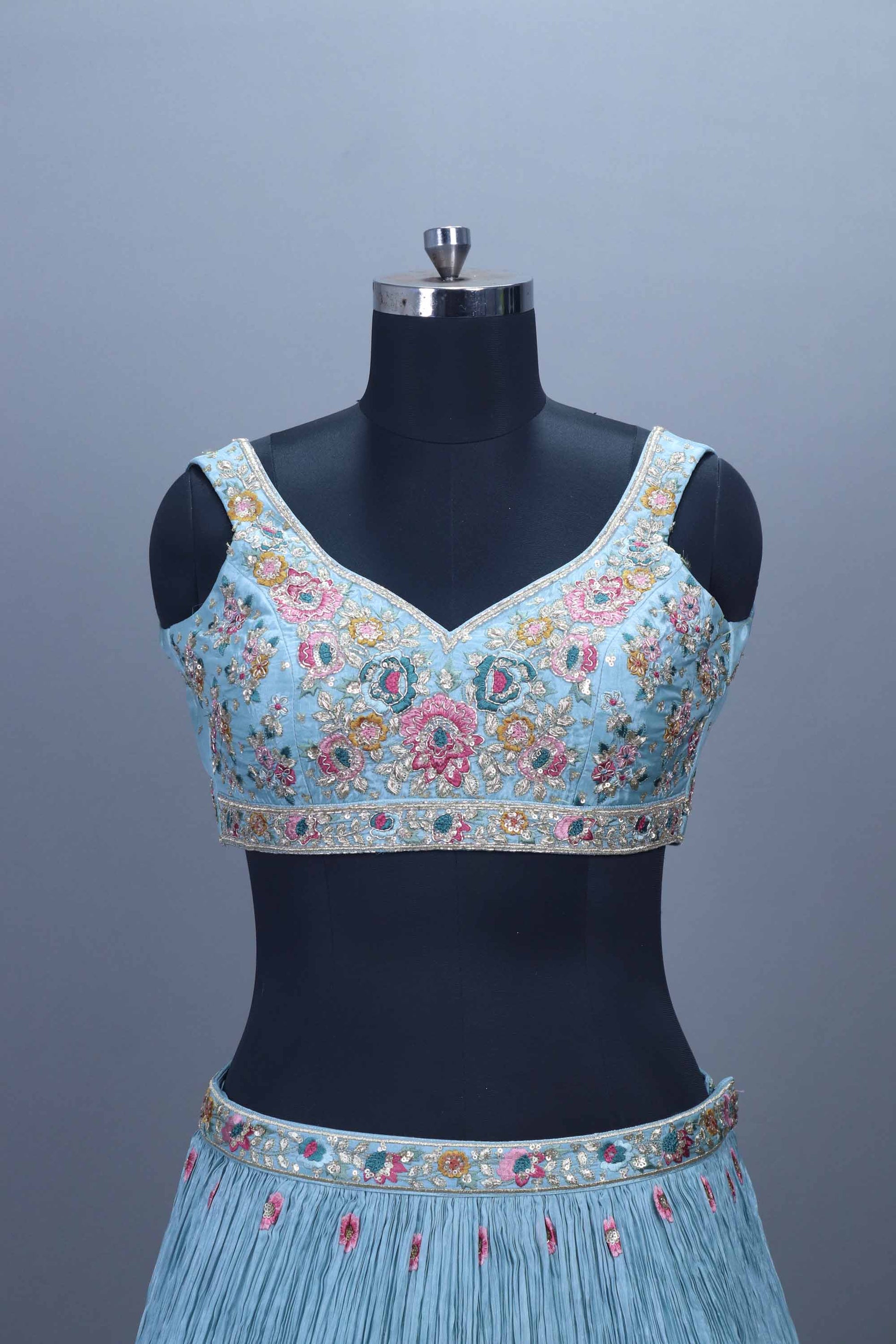 Elevate your festive and wedding wardrobe with this Sky Blue Heavy Embroidered Lehenga Choli with Floral Thread Work Dupatta, designed to bring together elegance, tradition, and modern craftsmanship. This stunning lehenga features intricate multicolor floral thread work, shimmering sequins, zari highlights, and a beautifully finished border that adds richness to every detail. The matching choli is adorned with heavy embroidery and delicate embellishments, offering a perfect blend of comfort and luxury. The set is completed with a soft, embroidered dupatta featuring scattered motifs and a beautifully crafted border, creating a graceful and royal look.