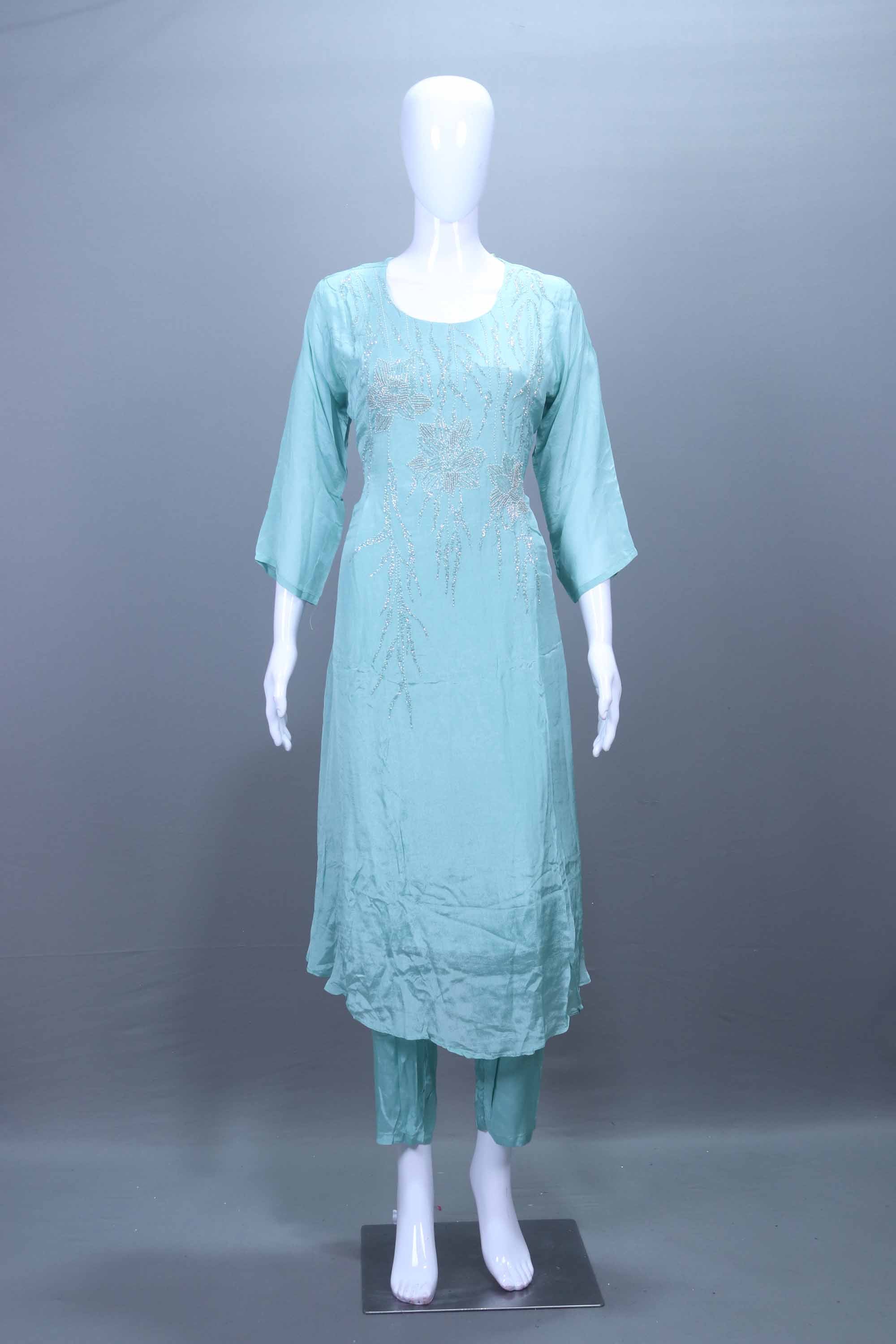Elevate your ethnic wardrobe with this elegant Sky Blue Silk Straight Kurta Set with Dupatta Festive Wear designed for festive celebrations and special occasions. Crafted from luxurious silk fabric, the kurta features intricate silver thread embroidery in floral patterns, adding a touch of sophistication and charm. The straight-fit silhouette offers timeless grace, paired with matching silk pants that ensure comfort and style throughout the day. The set includes a soft, flowy aqua dupatta that completes the look with effortless finesse. Perfect for weddings, festive gatherings, family functions, or traditional events, this pastel aqua ensemble delivers a refined and graceful appearance.