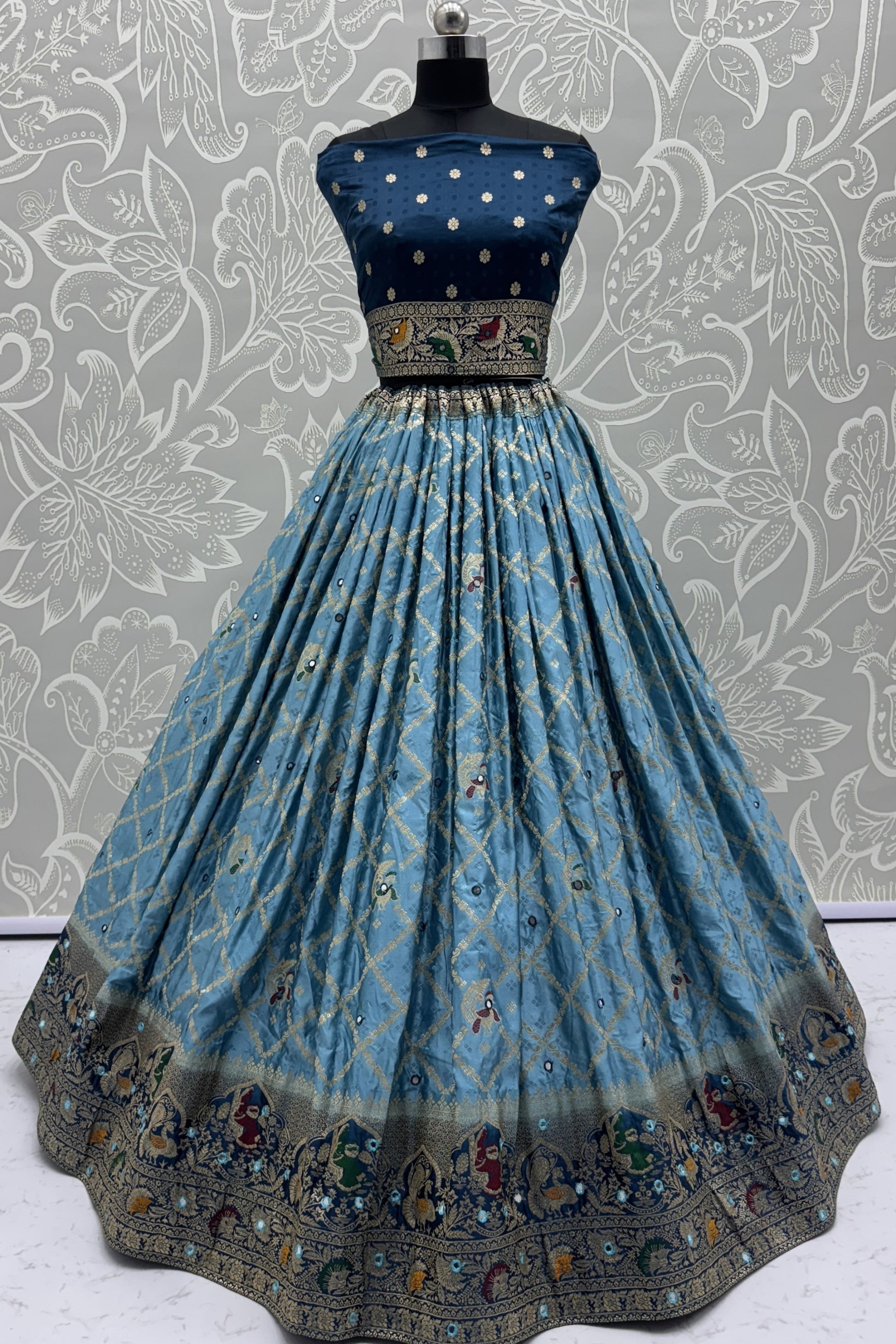 Embrace royal elegance with this Striking Blue Georgette Bridal Lehenga Choli with Heavy Zari and Resham Work, a timeless ensemble crafted for your special day. The sky blue lehenga is beautifully detailed with golden zari, multicolor resham embroidery, and delicate mirror work, creating a rich and regal aesthetic. Paired with a royal blue blouse adorned with floral motifs and a heavily embroidered dupatta featuring traditional peacock and floral designs, this set exudes luxury. Perfect for weddings, receptions, and festive celebrations, this bridal lehenga is a fusion of traditional charm and modern grace.