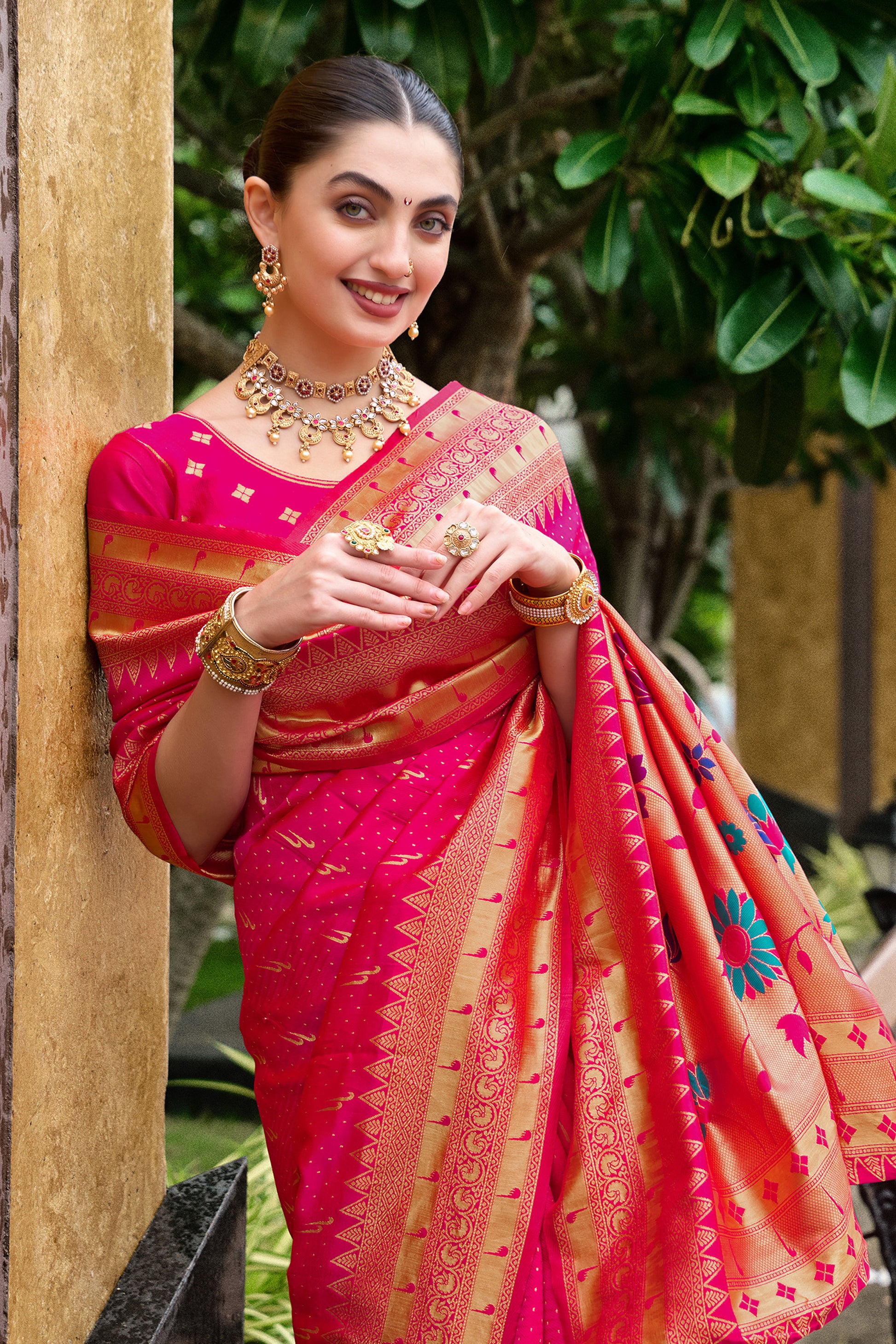 Stunning Pink Banarasi Silk Saree Floral Pallu Design