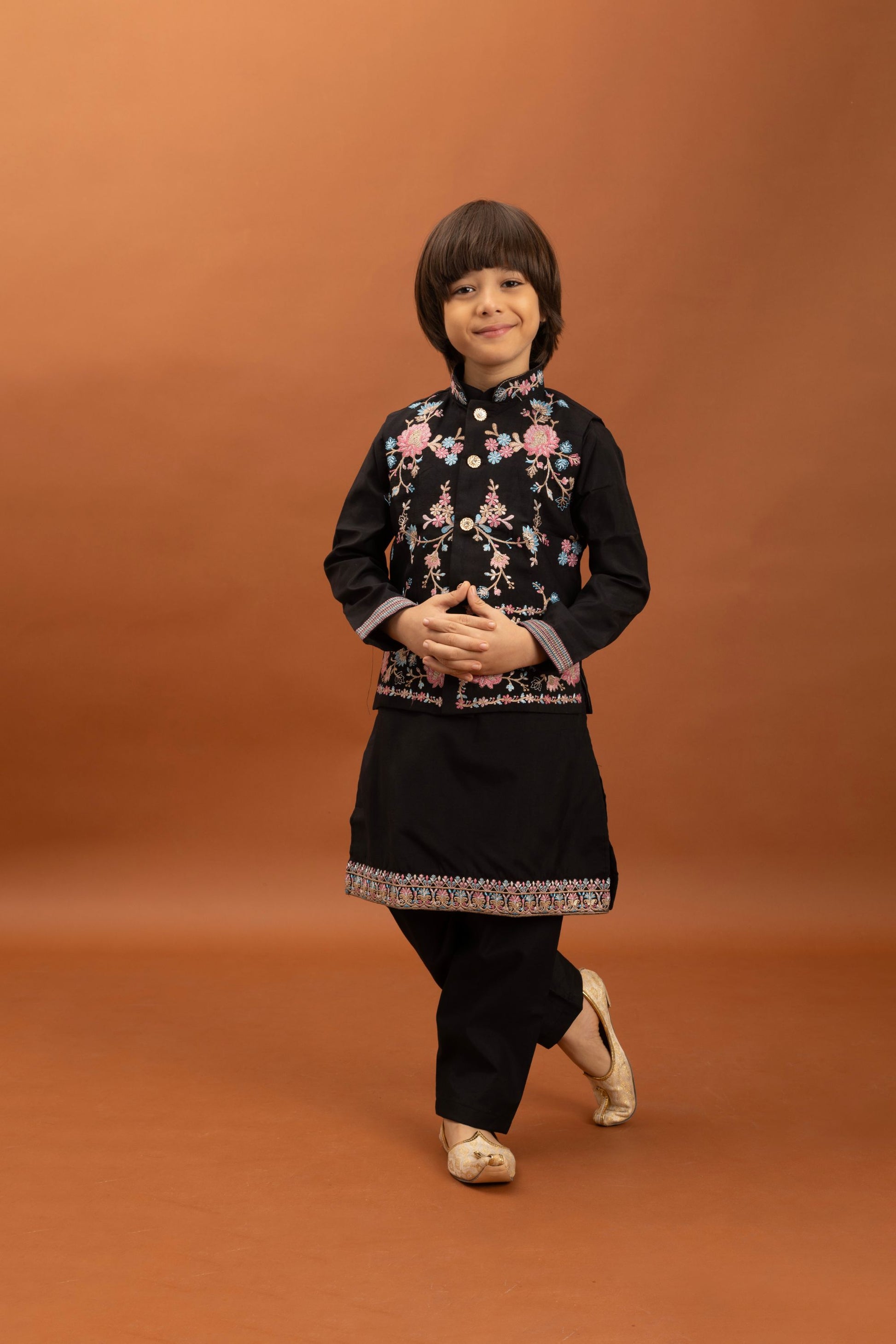 Let your little one shine in style with this Stylish Black Viscose Silk Embroidered Kurta Set with Floral Nehru Jacket for Boys. Designed from premium viscose silk fabric, this outfit offers a perfect balance of comfort and sophistication. The intricately embroidered floral Nehru jacket adds a festive touch, making it a great choice for weddings, celebrations, and cultural events. The set includes a sleek kurta, matching churidar, and a beautifully crafted jacket to complete the ethnic look.