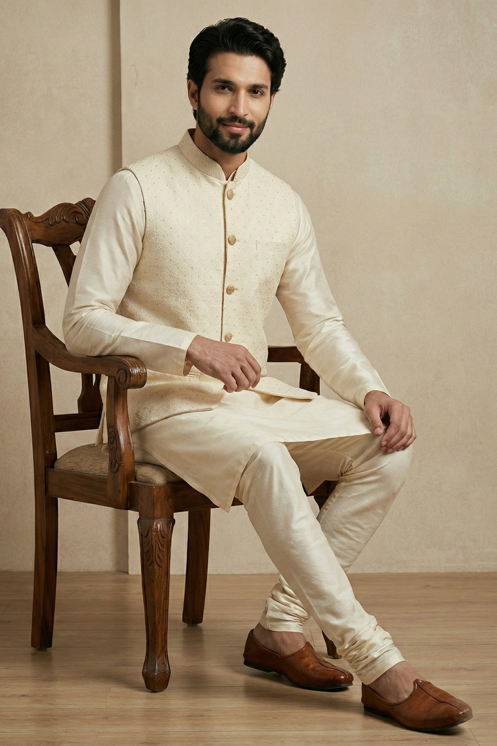Elevate your ethnic wardrobe with this Stylish Cream Jacquard Silk Jacket with Off-White Banarasi Dhupion Kurta Pajama Set for Men, a perfect blend of sophistication and traditional charm. Designed for weddings, festive celebrations, and special occasions, this timeless ensemble reflects refined craftsmanship and luxurious appeal. The Cream Jacquard Silk Jacket features subtle woven detailing that enhances its rich texture and royal look. Its tailored fit and classic buttoned front add a structured, modern finish. Paired with an elegant Off-White Banarasi Kurta, crafted from premium fabric with a smooth sheen, this outfit delivers both comfort and grandeur. The matching pajama completes the coordinated look, ensuring effortless style from day to night events.