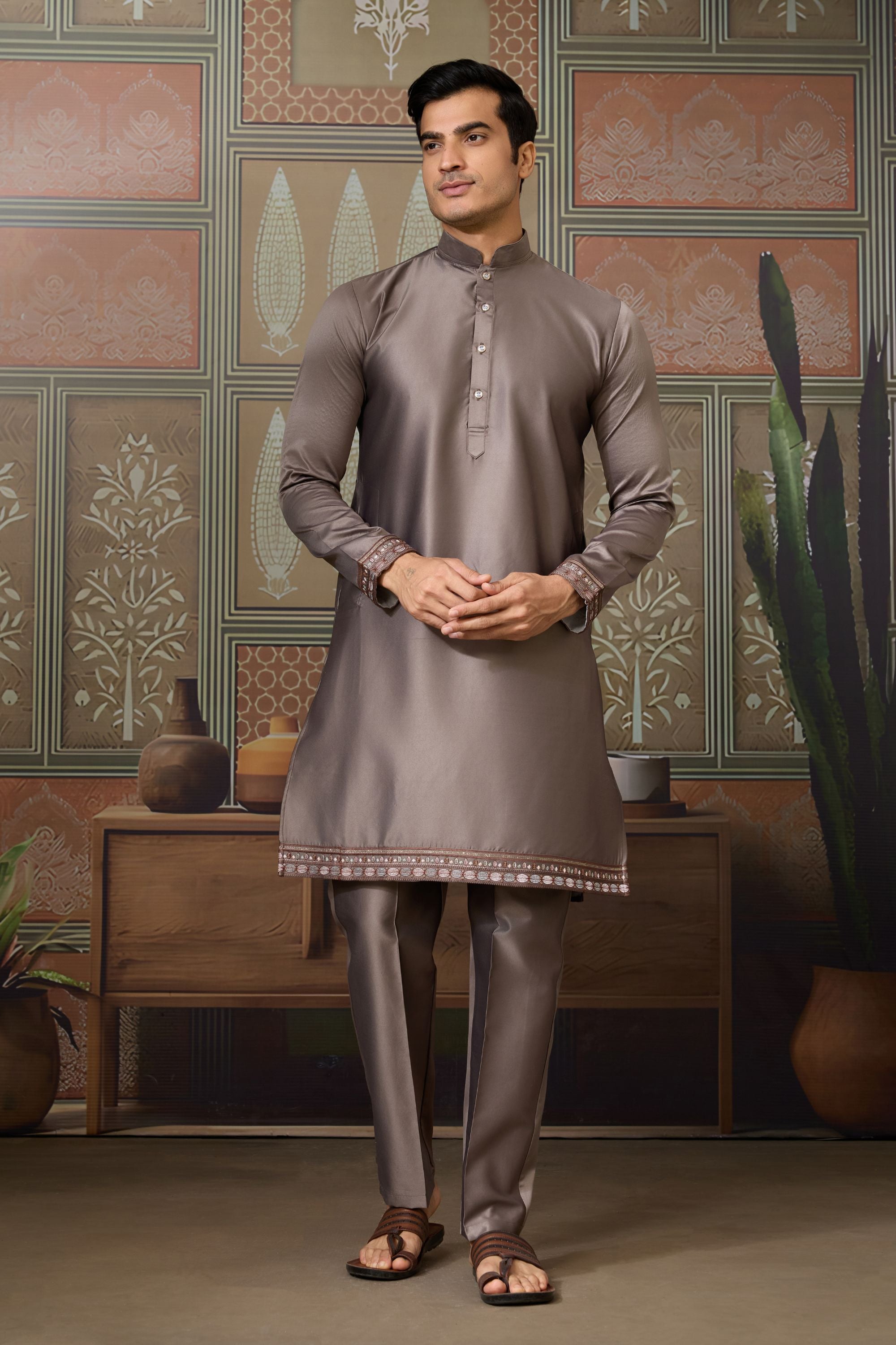 Redefine your ethnic wardrobe with this Stylish Grey Silk Embroidered Indo Western Kurta Pyjama Set with Jacket. Designed from premium silk fabric, this elegant outfit features intricate embroidery on the collar, cuffs, and jacket hemline, giving it a refined and regal touch. The Indo Western silhouette blends traditional craftsmanship with modern sophistication, making it a perfect choice for weddings, receptions, festive occasions, and cultural events. Paired with a matching pyjama, this ensemble ensures timeless style and superior comfort.