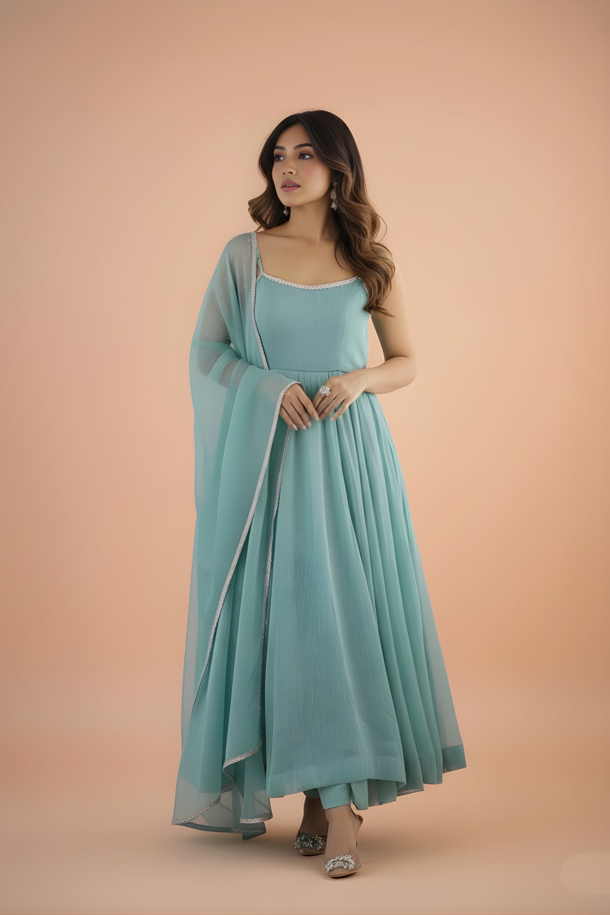 Add a touch of effortless elegance to your ethnic wardrobe with this Stylish Mint Green Readymade Salwar Suit, designed for women who love minimal yet graceful fashion. Crafted from soft, lightweight and flowy fabric, this suit features a soothing mint green shade that exudes freshness and sophistication.The kurta comes with a sleek sleeveless design and a beautifully flared silhouette, offering a modern twist to traditional ethnic wear. Paired with a comfortable matching bottom and a sheer dupatta finished with subtle border detailing, this ensemble creates a refined and balanced look perfect for multiple occasions.Ideal for festive celebrations, parties, evening gatherings, weddings, and special occasions, this readymade salwar suit ensures all-day comfort while keeping you stylish.