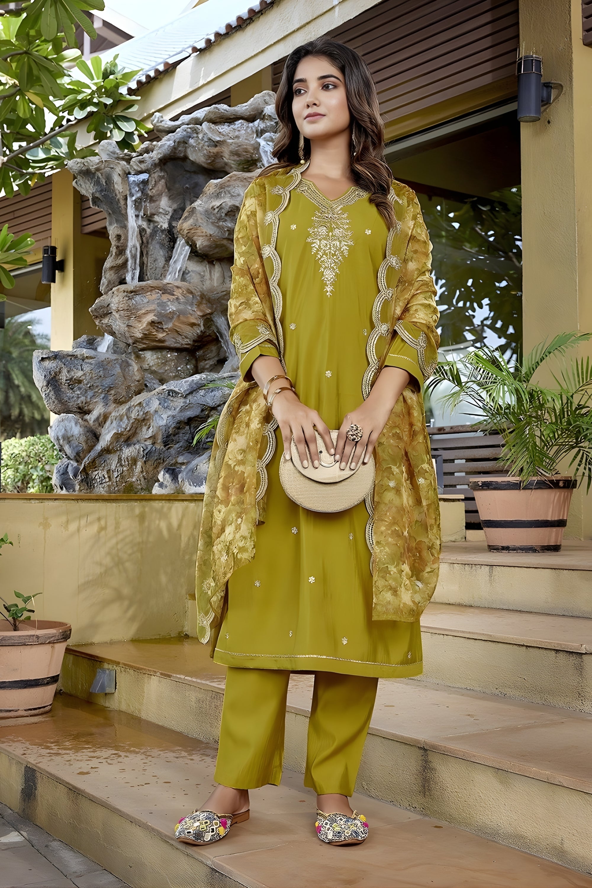 Bring elegance and comfort together with this Stylish Olive Green Embroidered Straight Suit, crafted for women who love subtle yet striking ethnic fashion.The premium-quality kurta features beautiful thread embroidery on the neckline and scattered motifs throughout, giving it a refined festive appeal. Its straight-cut silhouette paired with matching pants ensures a graceful and modern look.  Lightweight, comfortable, and beautifully detailed, this suit is perfect for festive events, family gatherings, poojas, parties, and casual celebrations.
