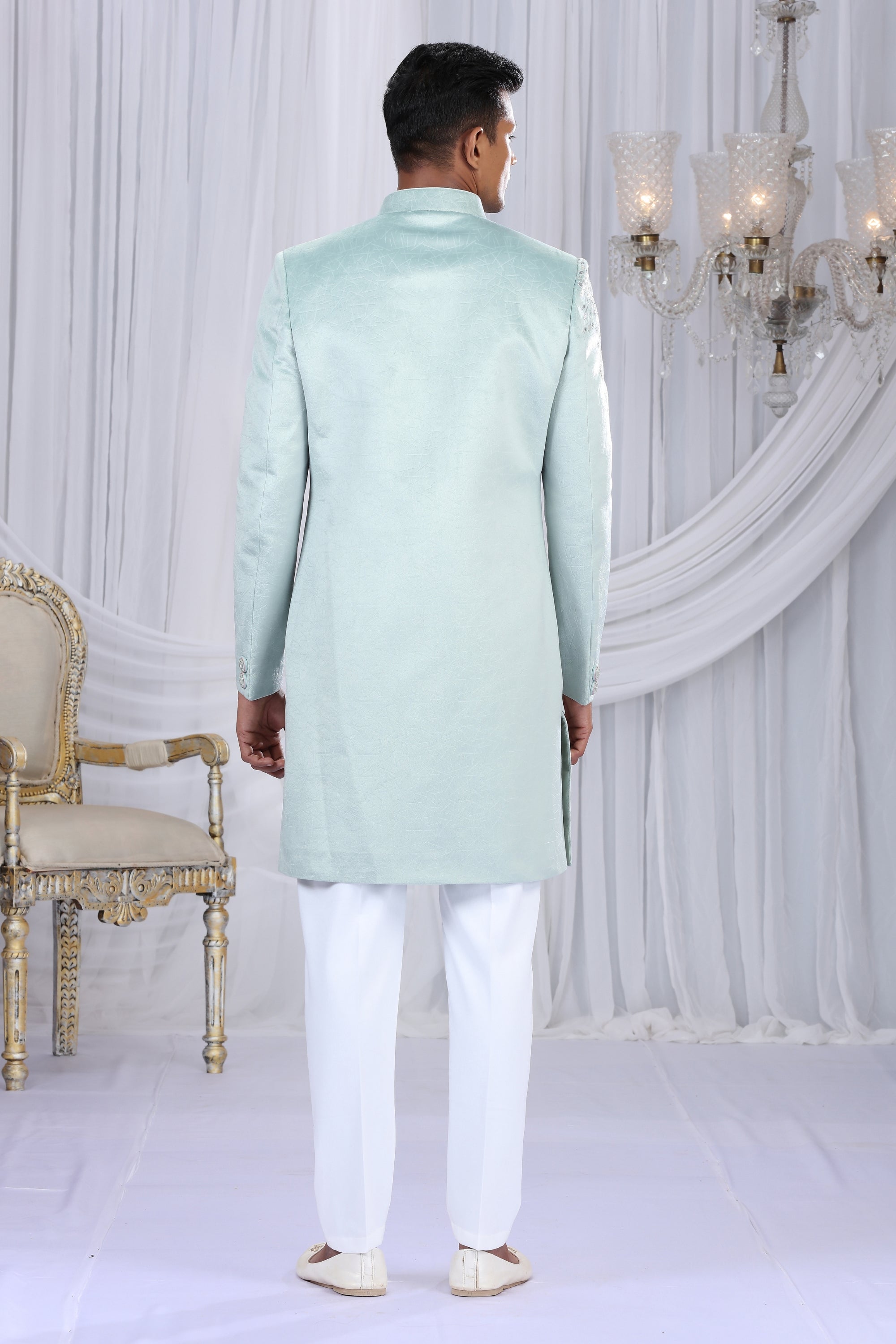 Stylish Pista Green Velvet Embroidered Indo Western Sherwani for Men with White Churidar
