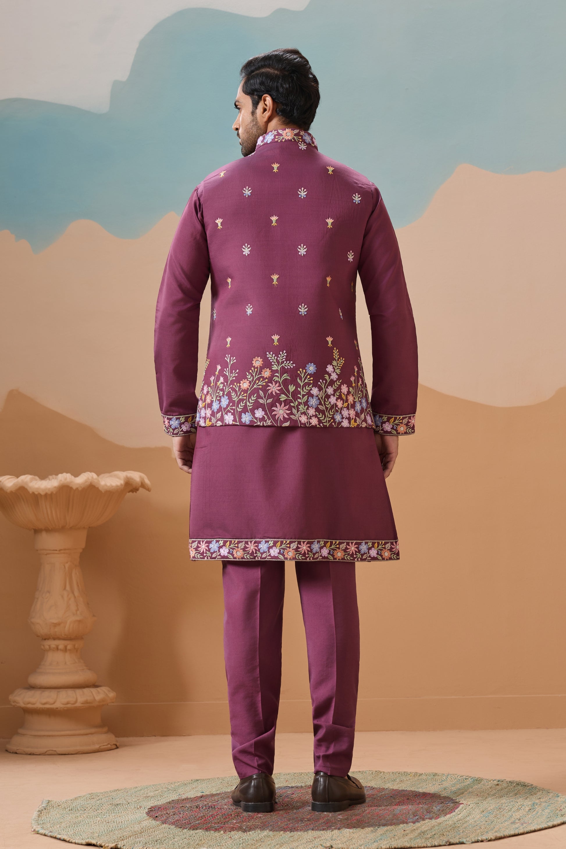 Stylish Purple Embroidered Silk Kurta Set with Floral Jacket for Wedding