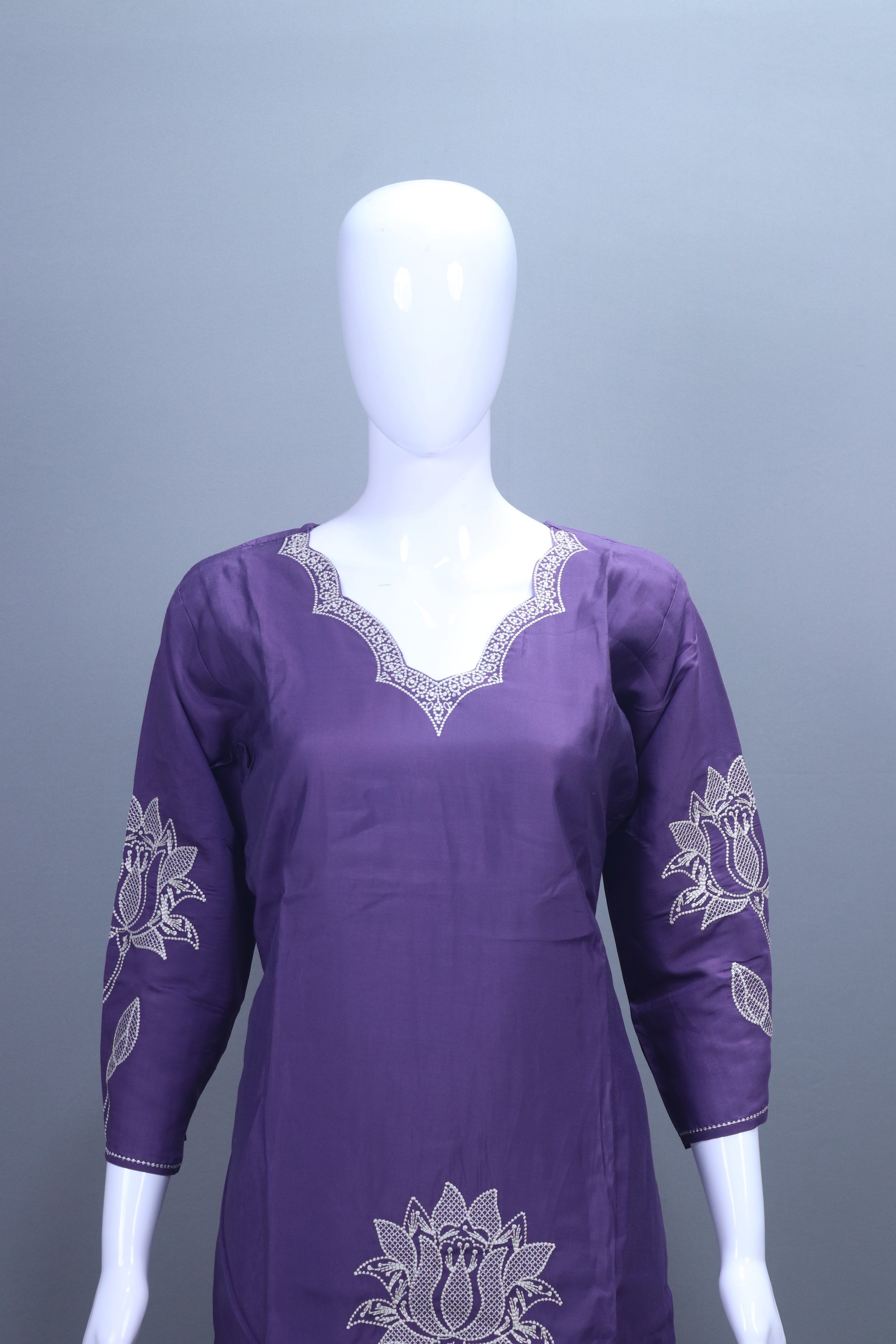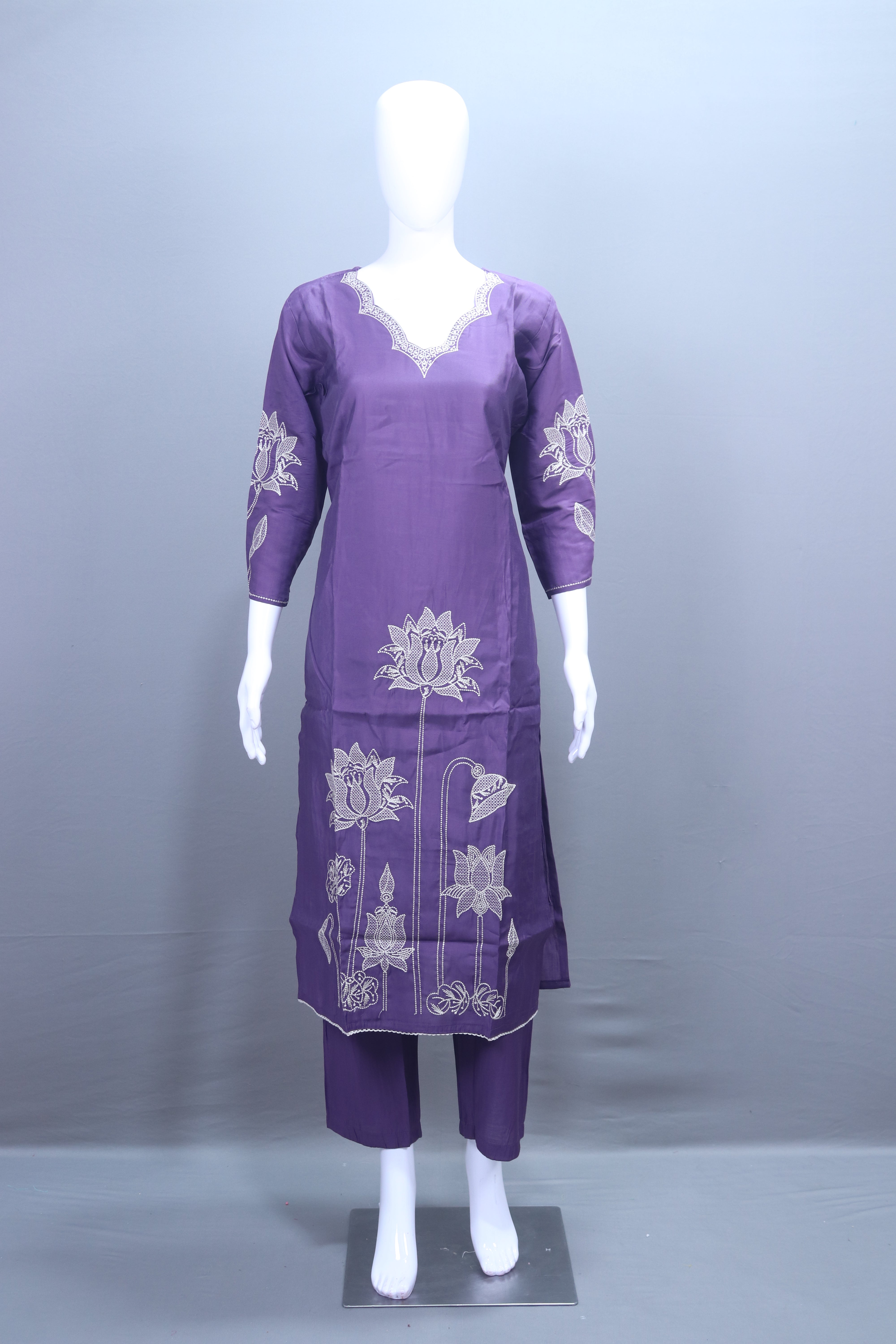 Add elegance to your ethnic collection with this Stylish Purple Suit Set Dupatta Casual Occasions. Crafted from premium-quality cotton fabric, this outfit ensures comfort and style throughout the day. The kurta features intricate white floral embroidery along the neckline, sleeves, and front panel, lending it a graceful and traditional appeal. Paired with a matching pant and a lightweight dupatta adorned with delicate embroidery, this set is perfect for festive celebrations, family gatherings, and cultural events.
