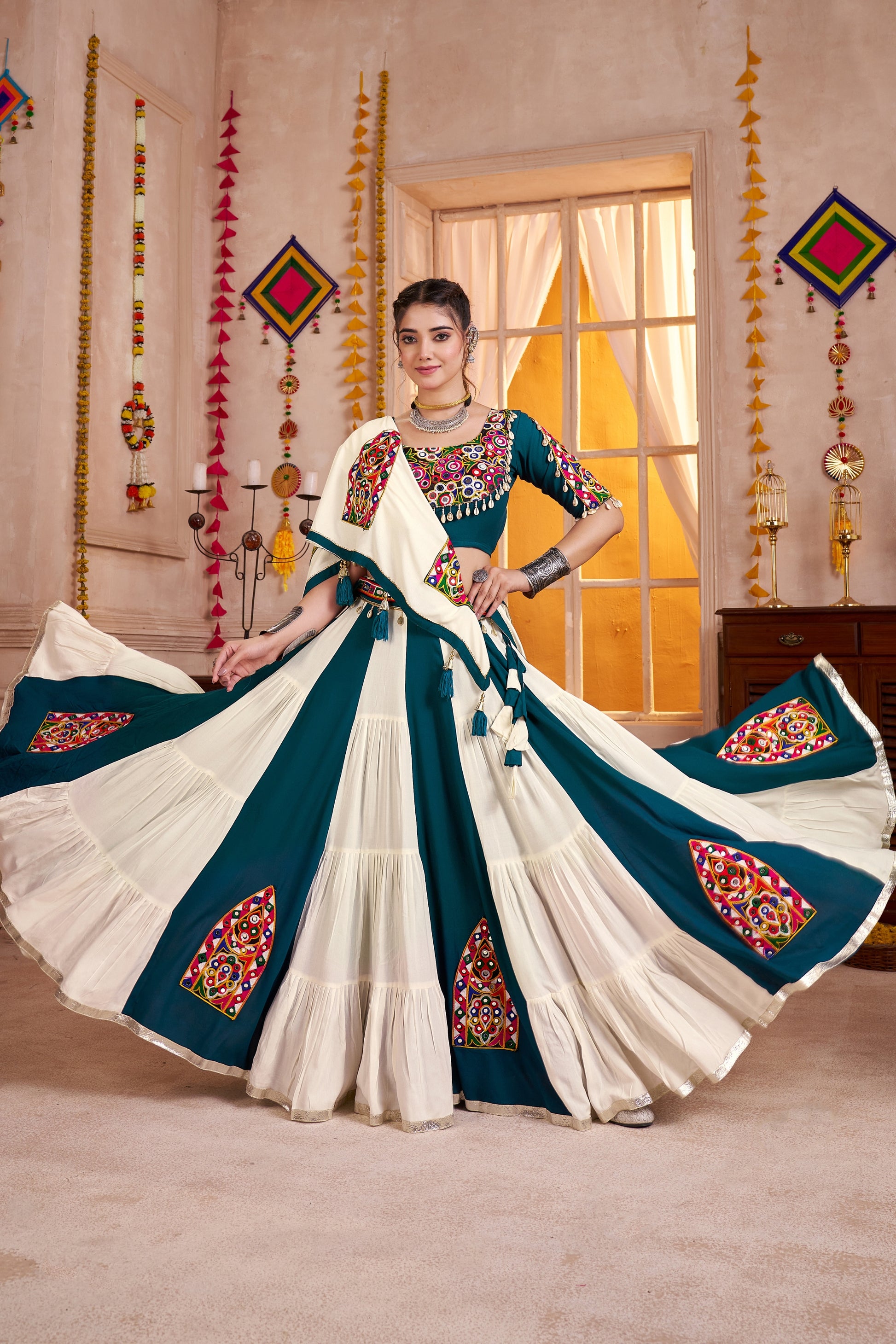 Celebrate the festive season in style with this Elegant Teal and Cream Navratri Lehenga Choli featuring exquisite multicolor Kutchi mirror embroidery. The rich teal blouse is beautifully adorned with traditional handwork, while the cream flared lehenga is highlighted with vibrant embroidered motifs for a perfect ethnic charm. The matching dupatta with tassel detailing completes the look, making it ideal for Garba, Dandiya nights, weddings, and festive celebrations. Crafted from premium fabric for comfort and durability, this lehenga choli ensures you shine with grace and elegance.