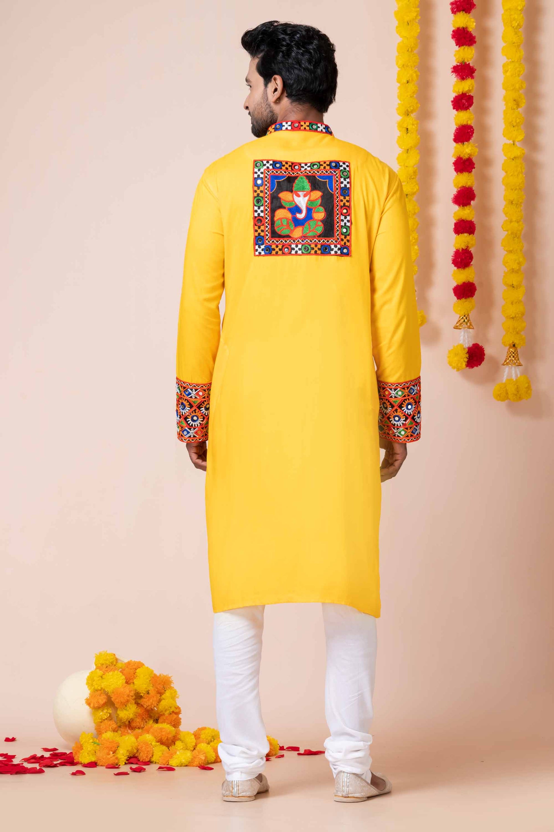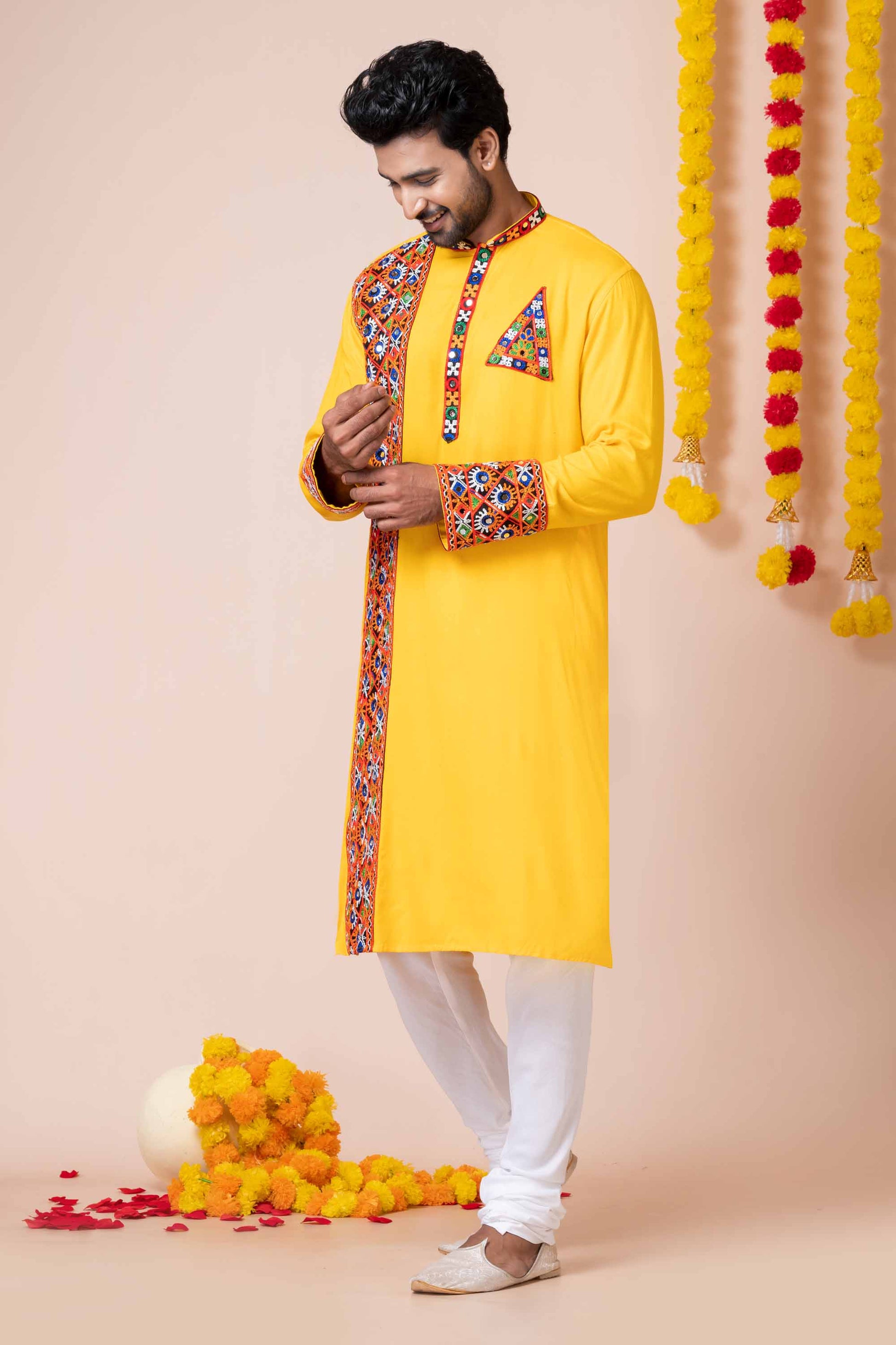 Brighten up your festive wardrobe with this Yellow Rayon Kurta Pajama Set for Men, beautifully designed with multicolor mirror embroidery and traditional Gujarati patterns. The kurta features intricate embroidery on the placket, cuffs, chest pocket, and side panel, adding a vibrant ethnic charm to the bold yellow base. Crafted from premium rayon fabric, this outfit combines comfort with elegance, making it perfect for Navratri, Garba nights, weddings, pujas, and cultural celebrations. Paired with a classic white pajama, this kurta pajama set ensures a stylish and festive look.