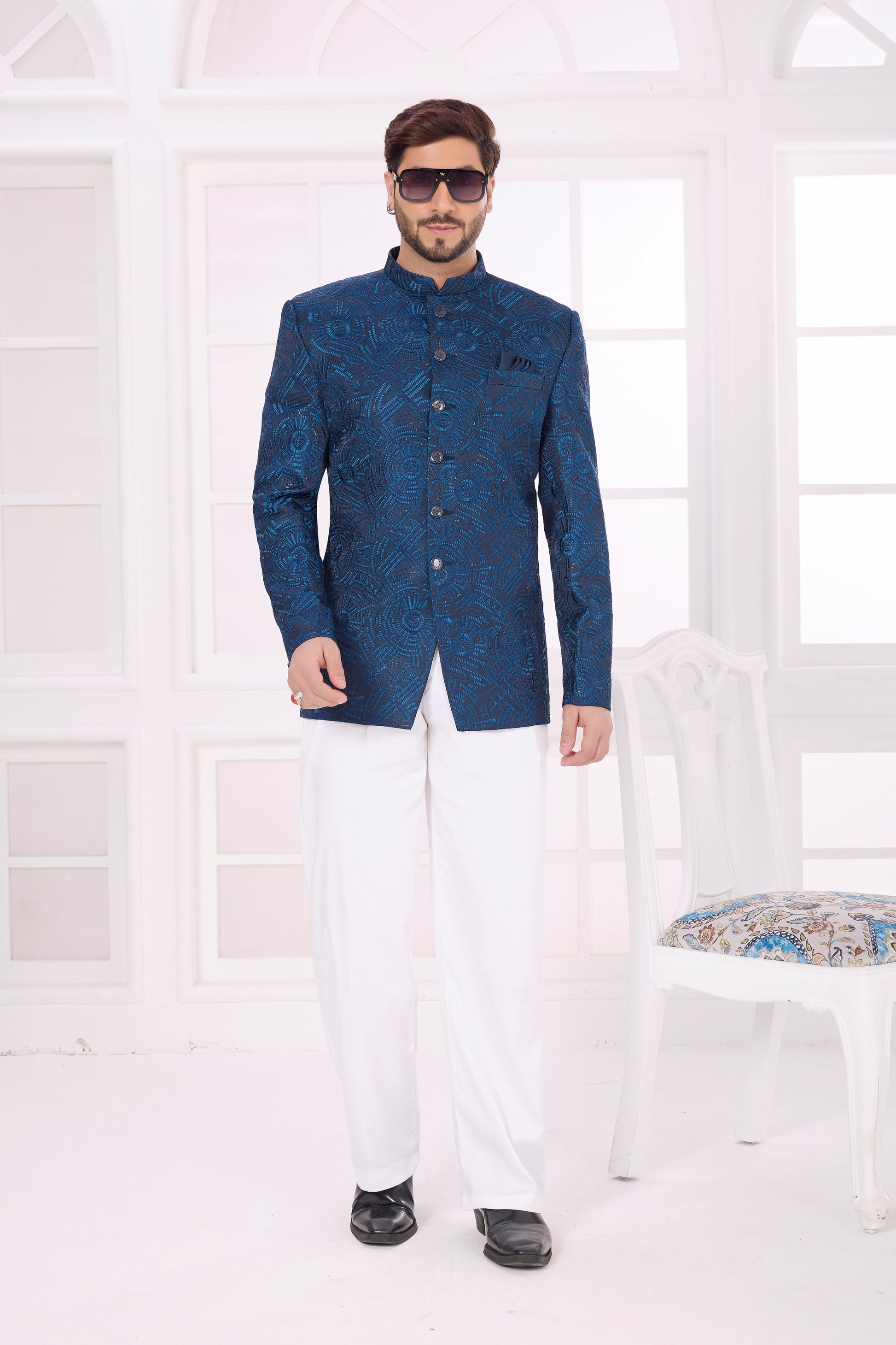 Step into timeless elegance with this men’s royal blue textured Jodhpuri jacket, crafted for weddings, festive celebrations, receptions, and premium ethnic occasions. Featuring a sophisticated self-patterned design and a sharp band collar, this Indo-Western jacket delivers a regal appearance with modern tailoring. Made from high-quality fabric, this Jodhpuri blazer offers exceptional comfort, breathability, and durability. The structured fit enhances your silhouette while allowing ease of movement, making it perfect for long events and celebrations. Pair it effortlessly with white, beige, or contrasting trousers and traditional footwear to create a polished ethnic look.  This product includes only the Jodhpuri jacket. *Pant is not included
