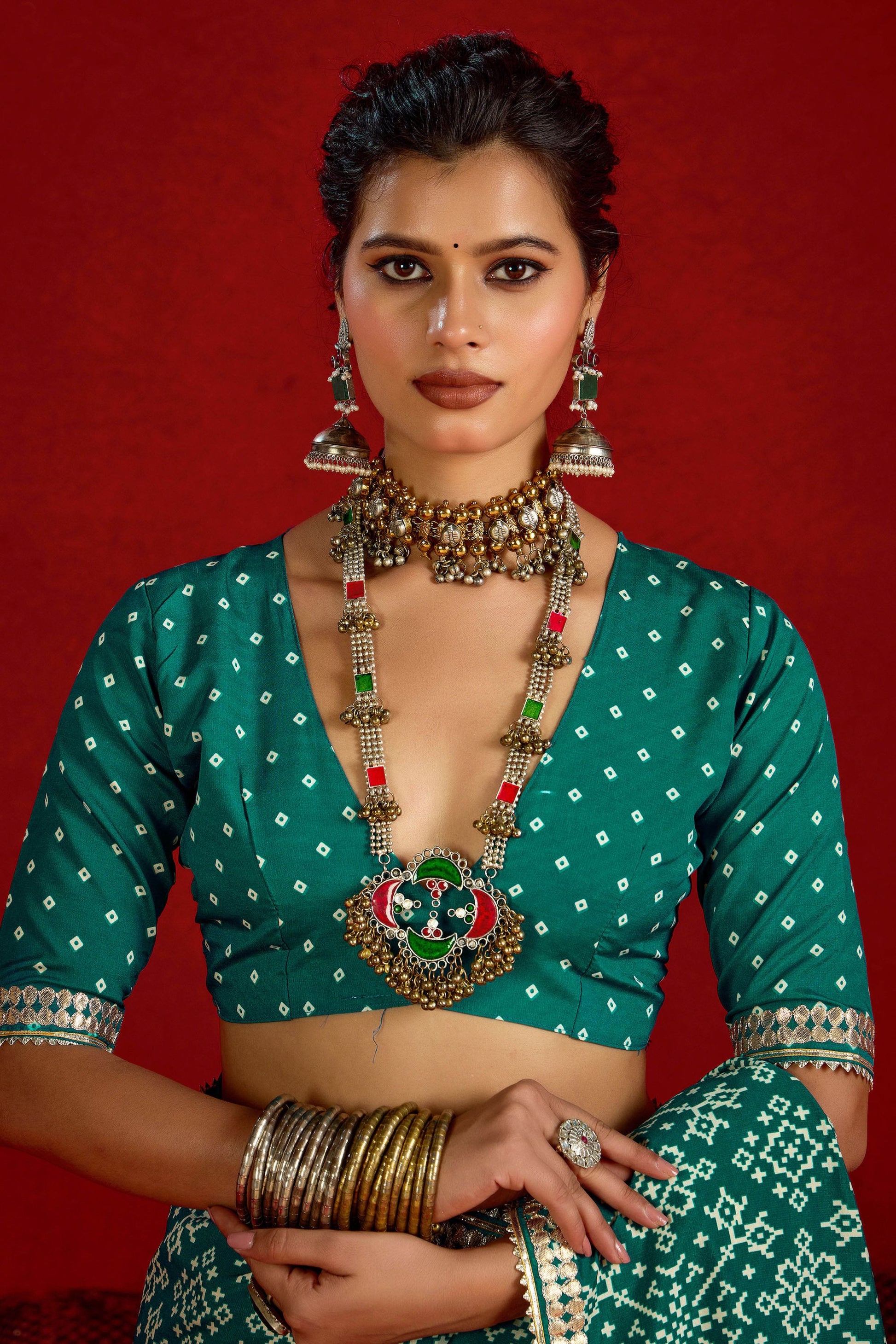 Teal Bandhej Print Designer Saree Matching Blouse Festive Wear