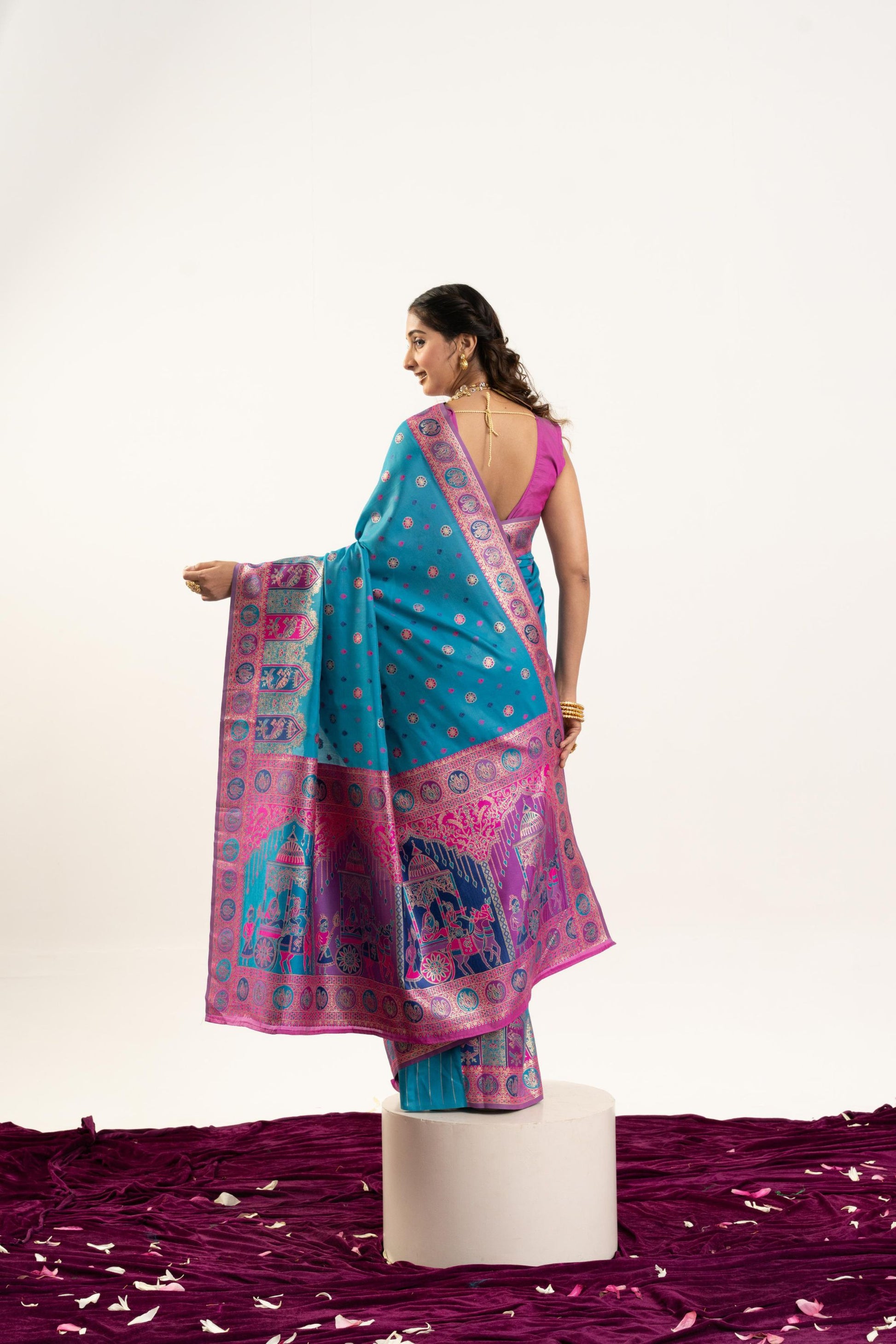 Elevate your festive wardrobe with this Teal Blue Banarasi Silk Saree Pink Border Festive Wear Saree, beautifully adorned with pink zari weaving and intricate traditional motifs. Crafted from premium silk fabric, this saree features a luxurious drape and a vibrant color combination that stands out at weddings, festivals, and grand celebrations. The saree comes with a contrasting pink blouse that enhances its rich ethnic appeal. The detailed zari border and storytelling pallu showcasing traditional scenes make it a perfect choice for women who love timeless elegance.
