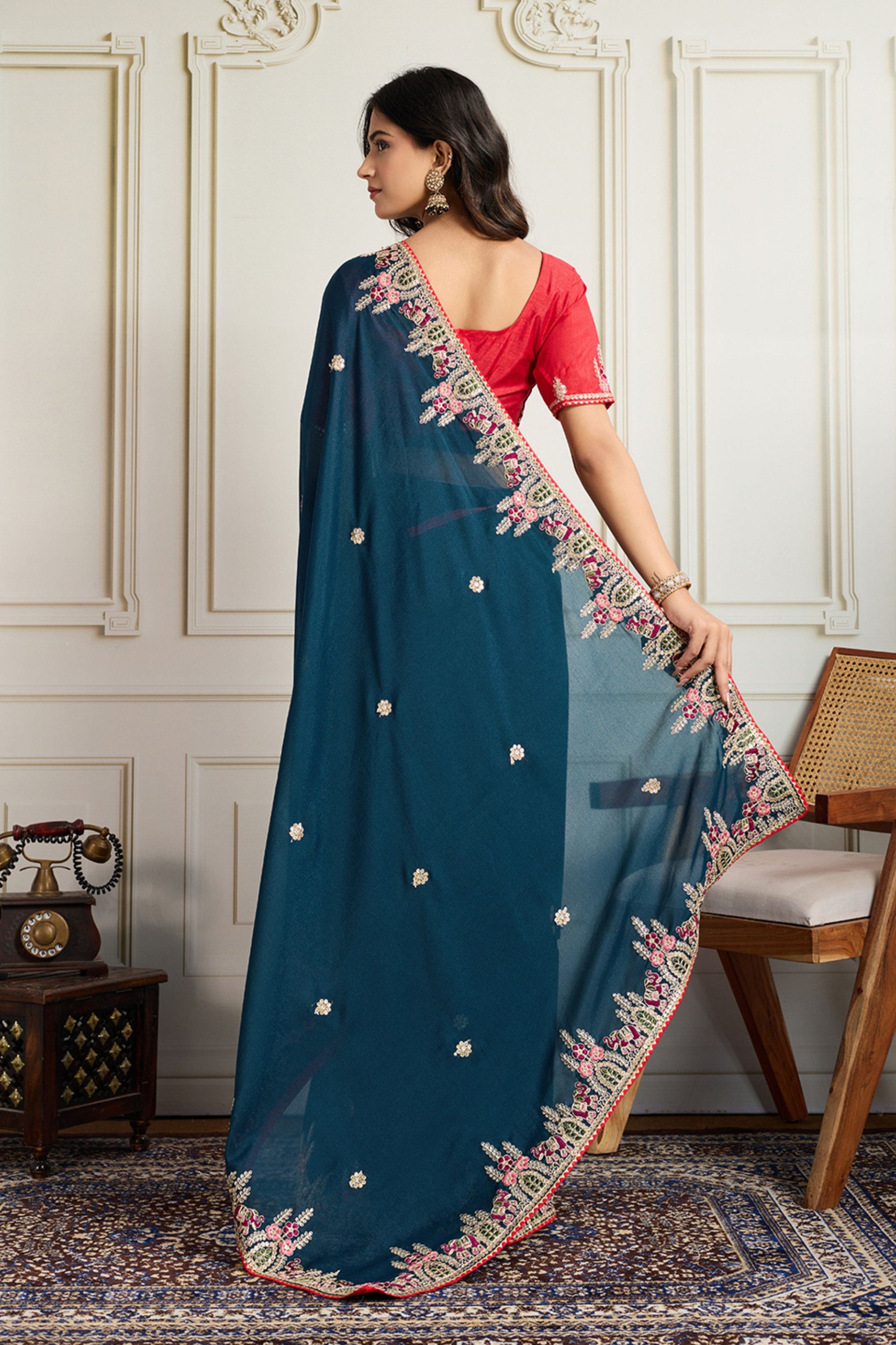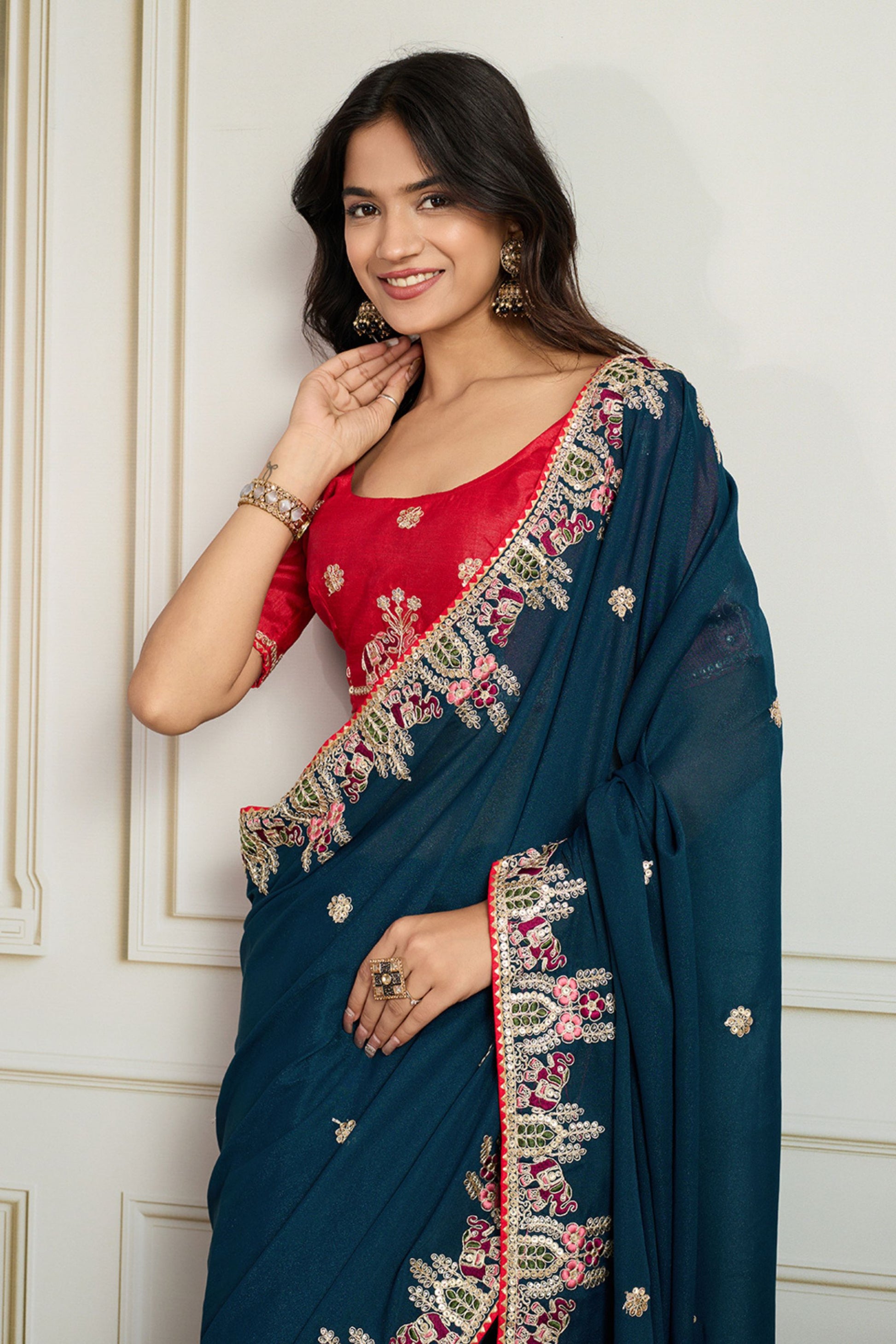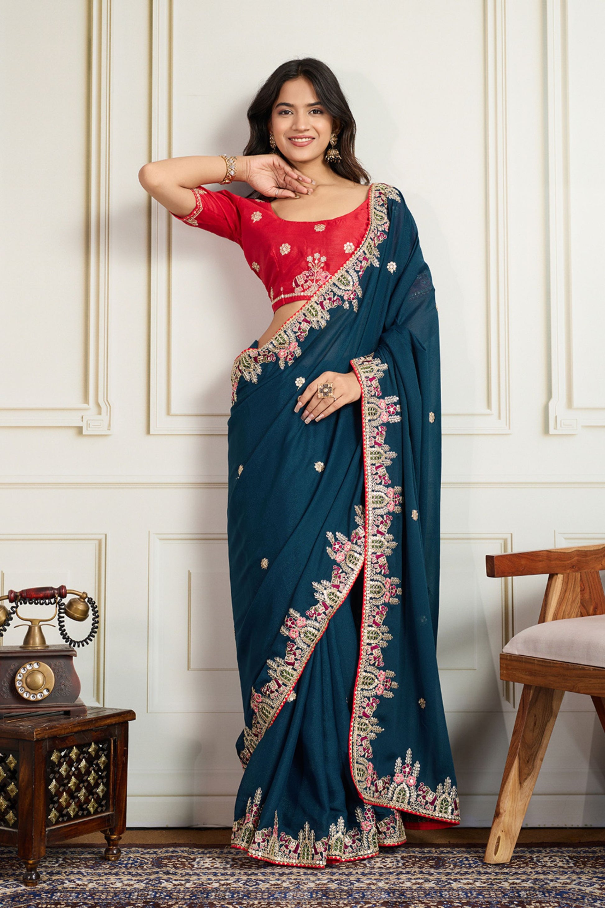 Teal Blue Saree with Red Blouse Designer Party Wear Silk Saree
