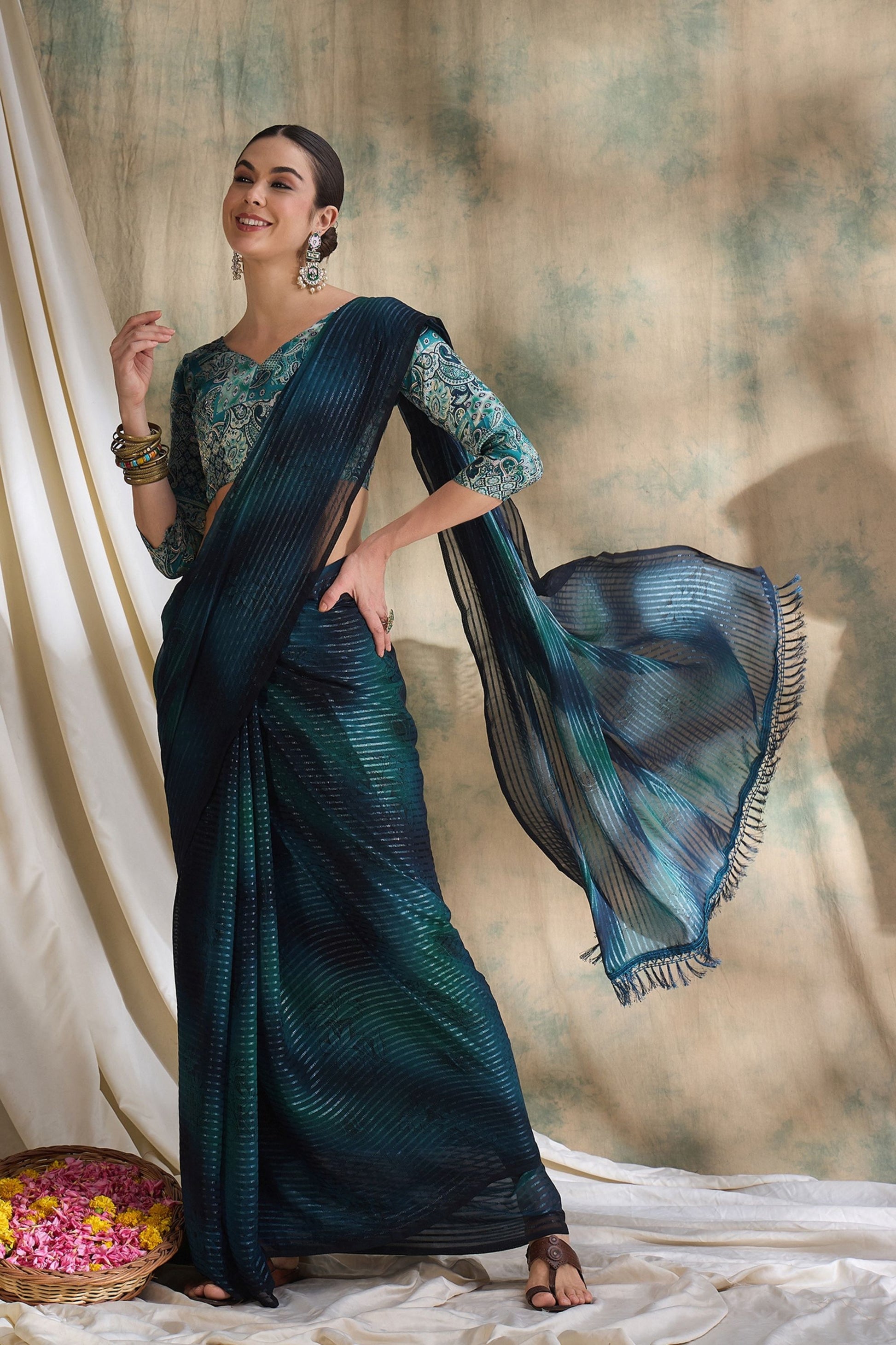 Crafted from a lightweight, flowy fabric, Teal Blue Satin Saree with Printed Designer Blouse Festive Wear a modern striped pattern blended with abstract shades of deep blue and green, giving it a rich, luxurious appeal. The subtle sheen enhances its graceful drape, making it perfect for daytime functions, receptions, cocktails, and festive celebrations. Paired with a stylish teal printed blouse featuring intricate motifs and a contemporary neckline, this saree offers the perfect balance of tradition and modern style. The 3/4th sleeves add refinement, while the overall aesthetic ensures you stand out with timeless elegance.